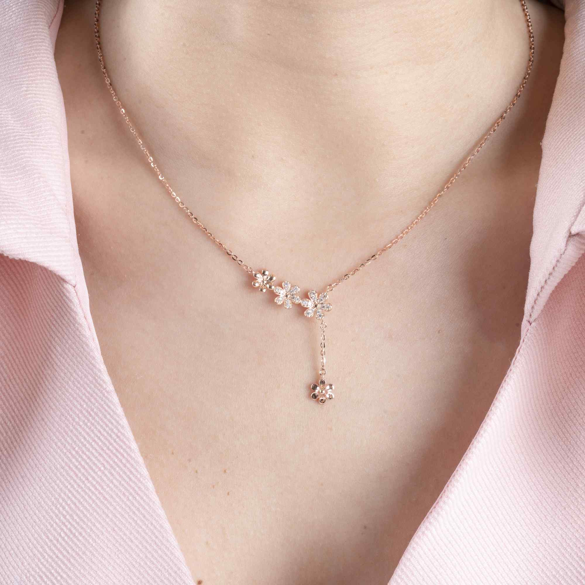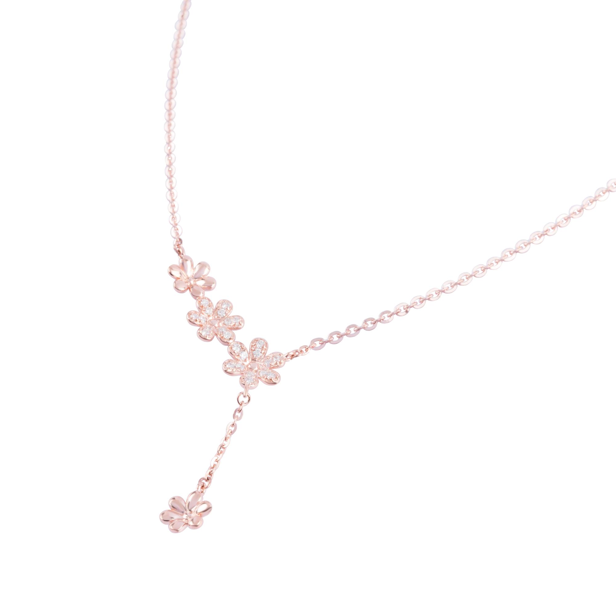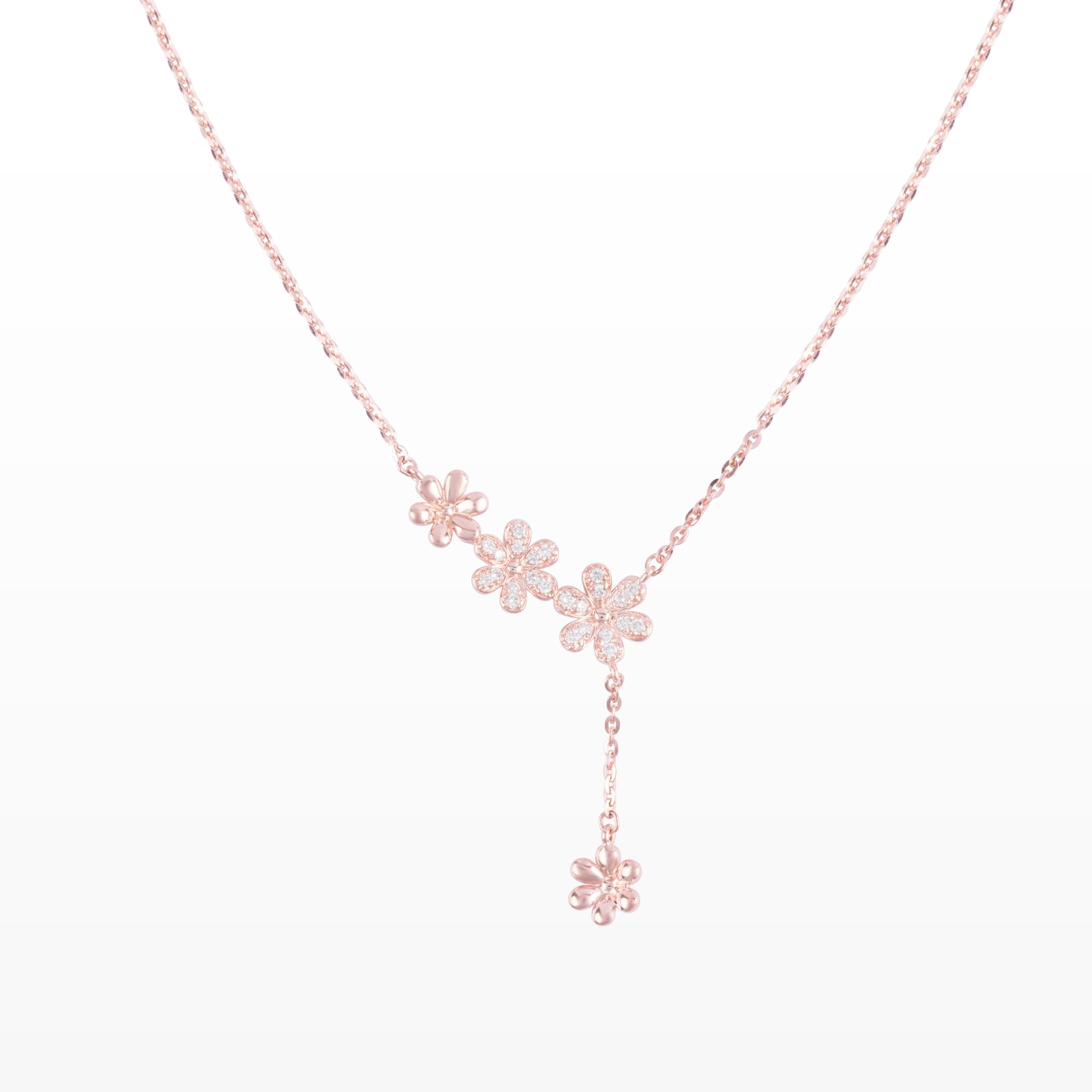 Thiết kế dây chuyền lấy cảm hứng từ những bông hoa đang nở rộ, biểu tượng của vẻ đẹp dịu dàng và sự tươi mới. Các cánh hoa được chế tác tinh xảo, đính những viên kim cương lấp lánh ở trung tâm, tạo hiệu ứng ánh sáng nhẹ nhàng như những giọt sương sớm trên cánh hoa.