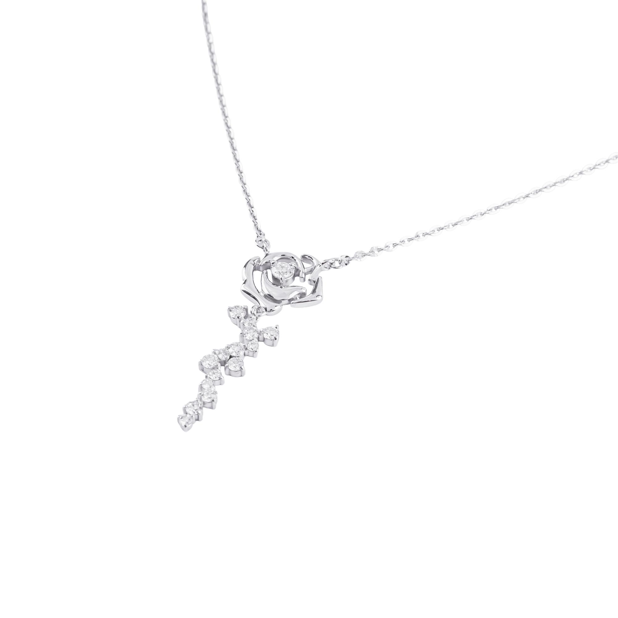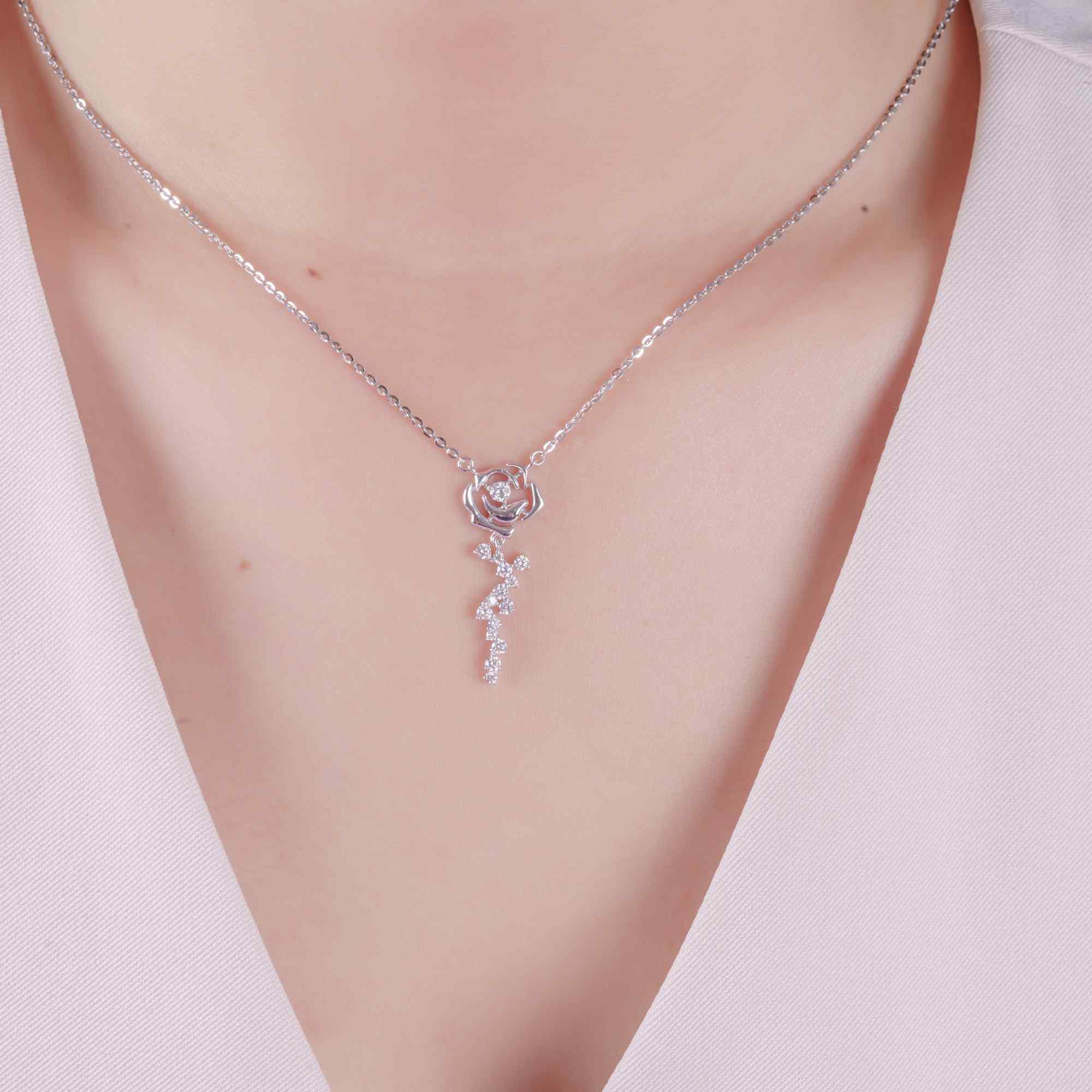 Dây cổ vàng trắng thiết kế hoa hồng thanh lịch, điểm nhấn chuỗi kim cương rủ nhẹ tạo hiệu ứng lấp lánh tinh tế. Kiểu dáng mềm mại, nữ tính, giúp vùng cổ thêm nổi bật nhưng vẫn giữ được vẻ sang trọng và nhẹ nhàng khi đeo hằng ngày hoặc dự tiệc.