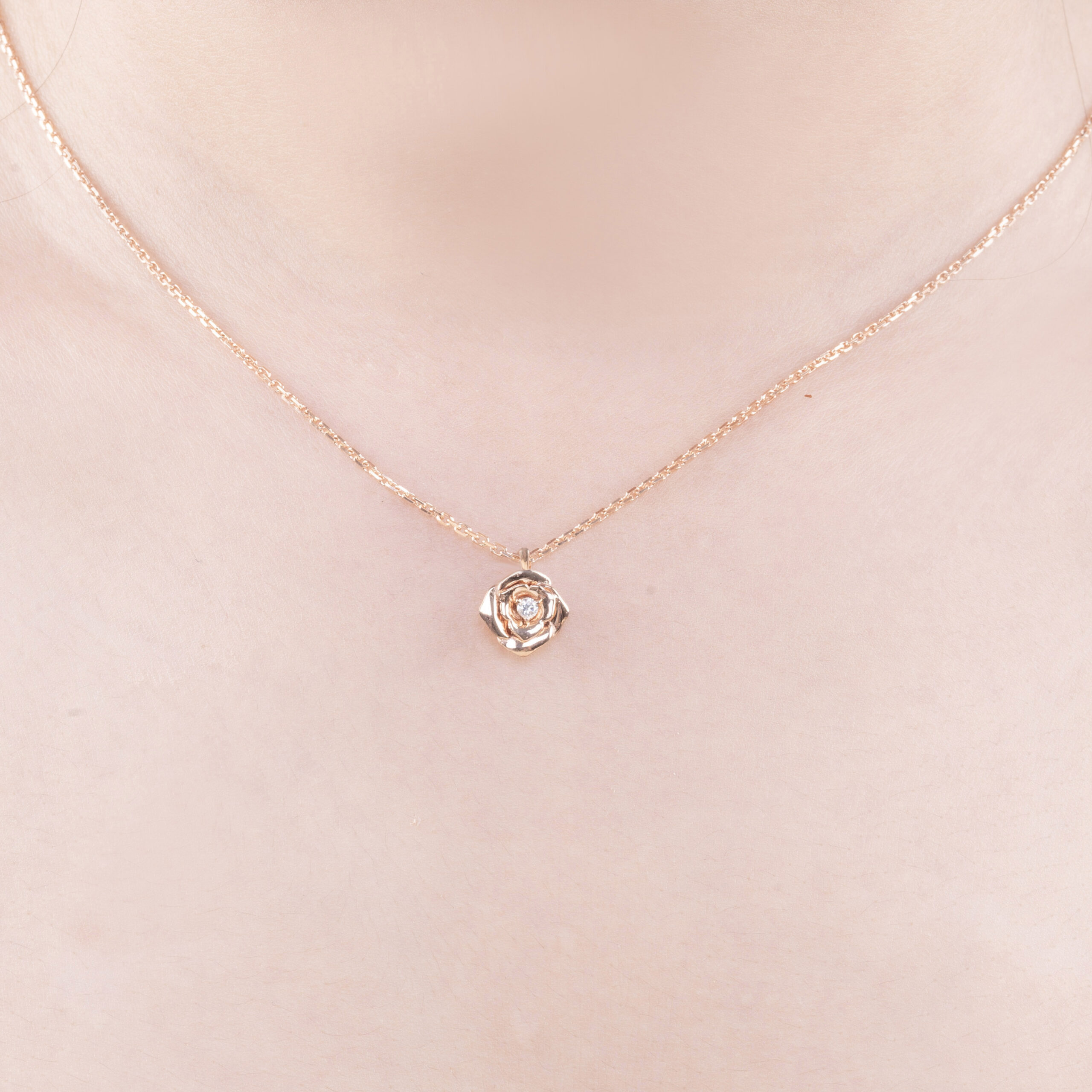 Mang hơi thở lãng mạn của sắc vàng hồng, mặt dây hoa mẫu đơn tỏa ra vẻ đẹp ngọt ngào và quý phái. Cánh hoa được chạm khắc mềm mại, xếp thành từng tầng đầy đặn – đúng tinh thần của hoa mẫu đơn, biểu tượng cho sự may mắn, viên mãn và nhan sắc nở rộ.