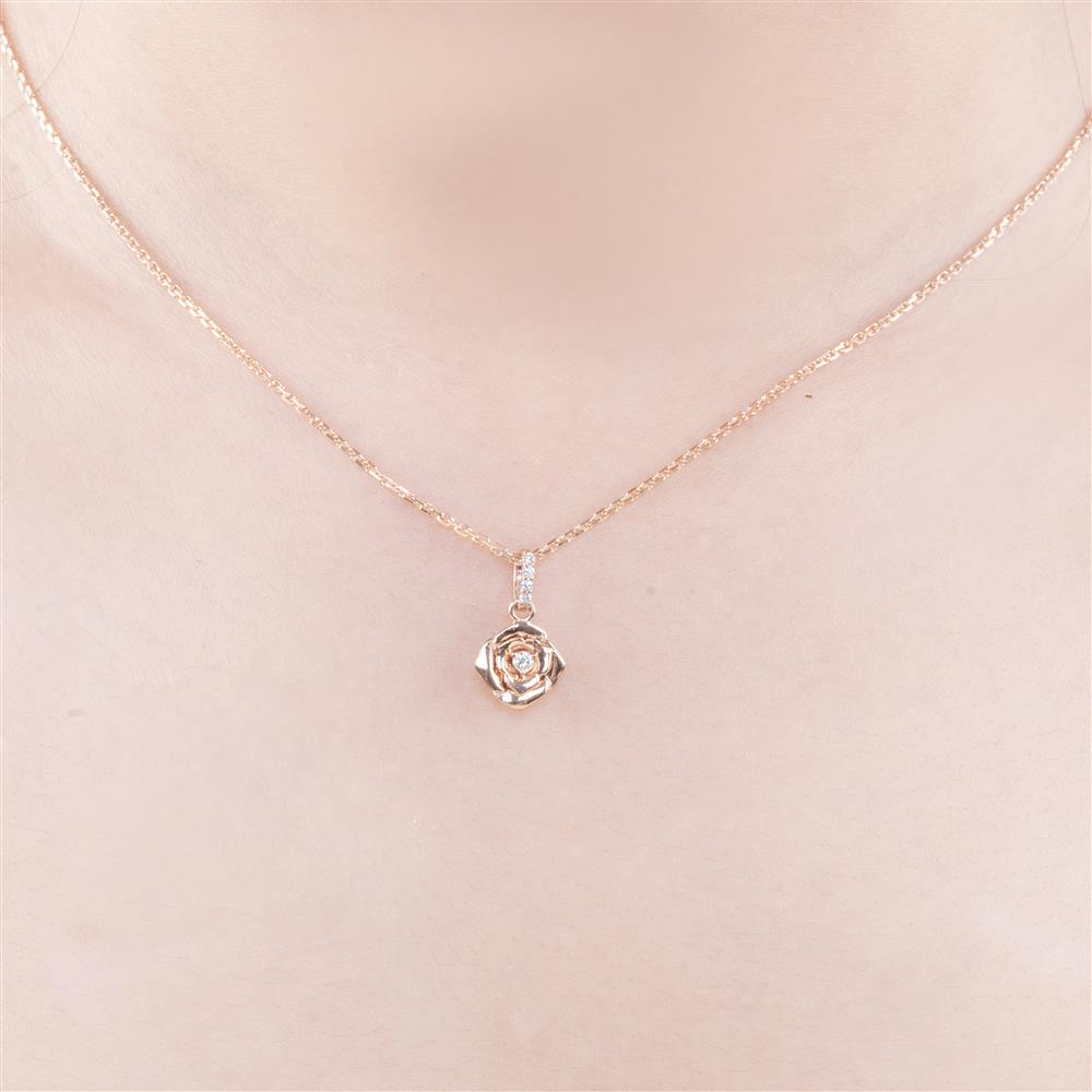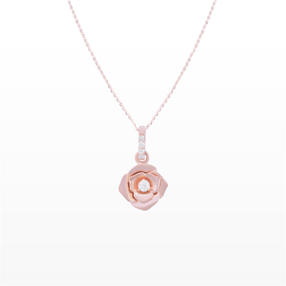 Mang hơi thở lãng mạn của sắc vàng hồng, mặt dây hoa mẫu đơn tỏa ra vẻ đẹp ngọt ngào và quý phái. Cánh hoa được chạm khắc mềm mại, xếp thành từng tầng đầy đặn – đúng tinh thần của hoa mẫu đơn, biểu tượng cho sự may mắn, viên mãn và nhan sắc nở rộ.
