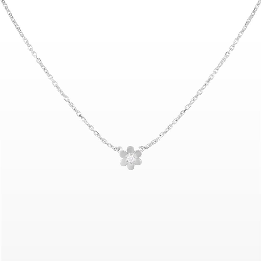 Mỗi cánh hoa được chế tác mềm mại, ôm lấy viên kim cương ở trung tâm, tạo nên điểm sáng tinh tế như nụ cười dịu dàng của người phụ nữ. Sắc trắng sang trọng giúp chiếc dây chuyền dễ phối cùng mọi phong cách, từ trẻ trung hằng ngày đến thanh lịch khi đi làm.