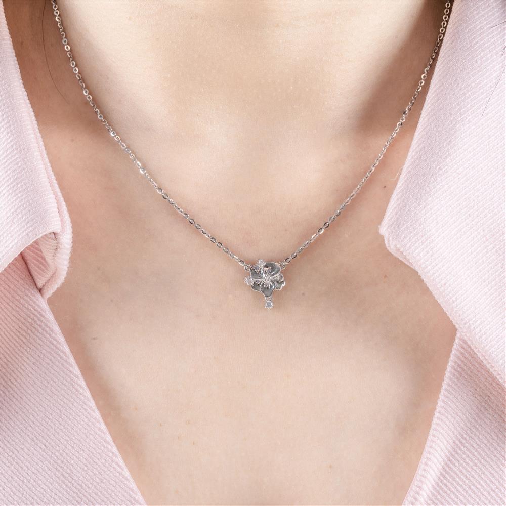 Dây chuyền kim cương sở hữu thiết kế mặt hoa nhỏ xinh, được tạo hình mềm mại với những cánh hoa bo tròn tinh tế. Các viên kim cương nhỏ được đính điểm khéo léo xung quanh và phía dưới mặt hoa, tạo hiệu ứng ánh sáng dịu dàng, mang đến vẻ đẹp nữ tính và thanh thoát.