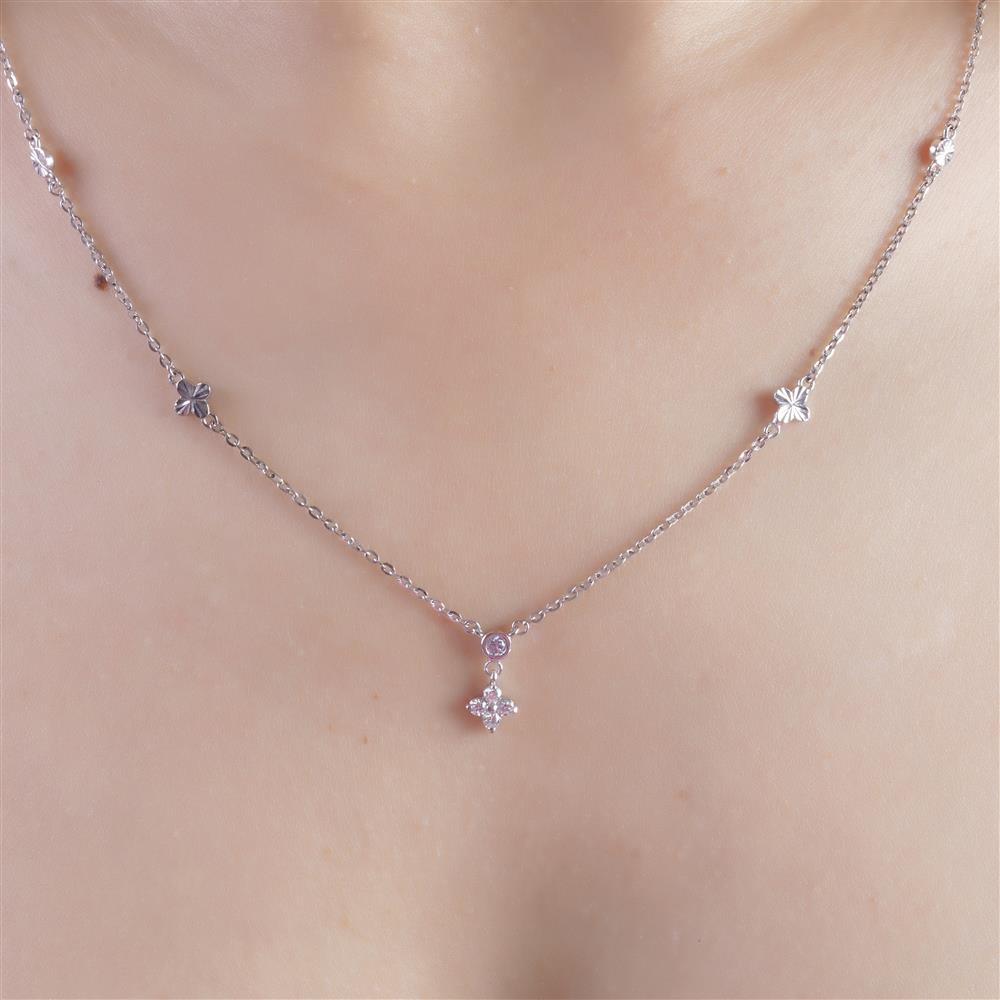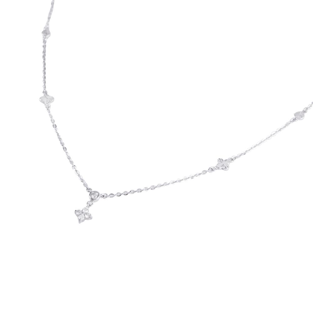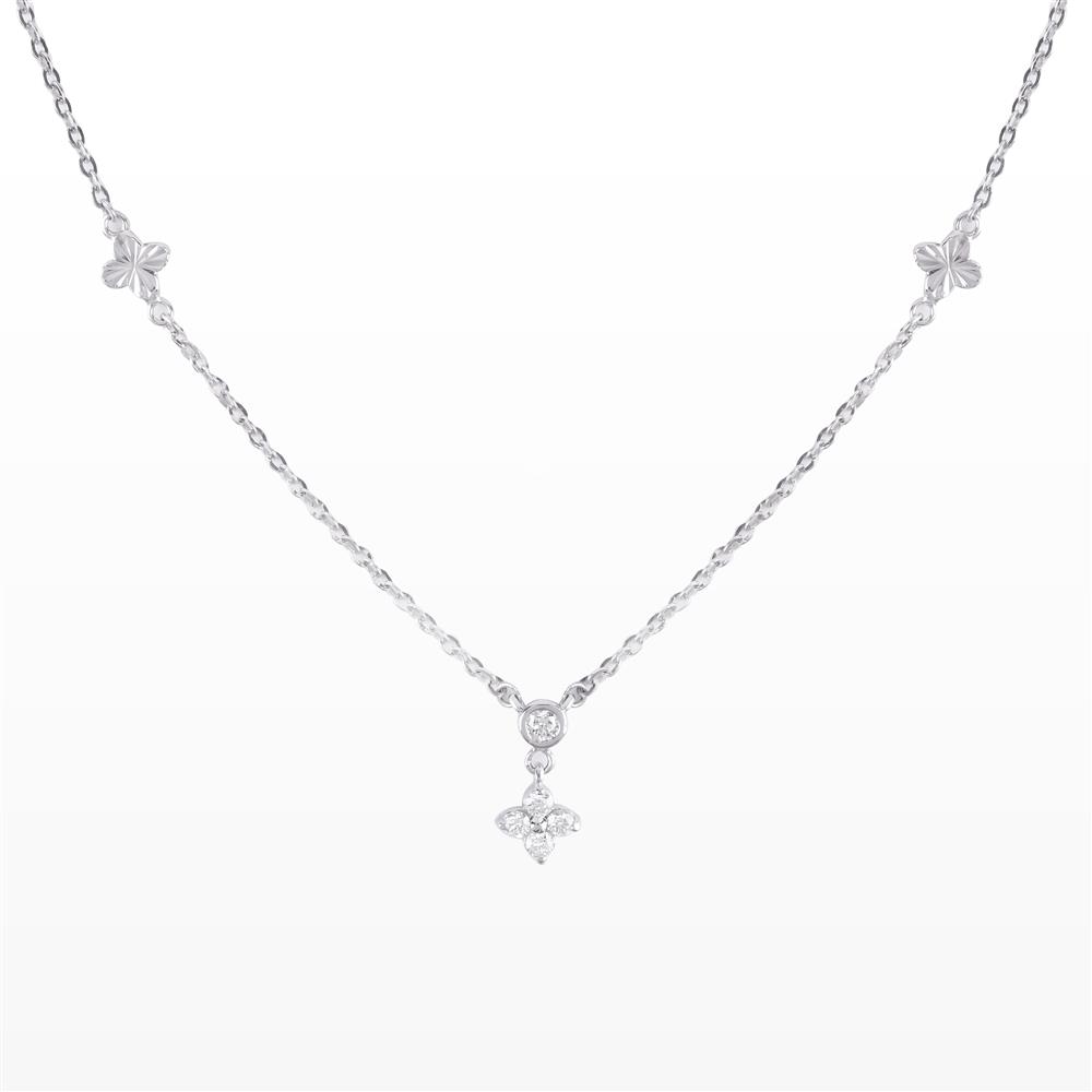 Dây chuyền kim cương được thiết kế điểm xuyết các chi tiết nhỏ tạo nhịp điệu mềm mại dọc theo dây. Trung tâm là viên kim cương tròn được treo nhẹ nhàng, bên dưới là họa tiết hoa 4 cánh đính kim cương, mang lại điểm nhấn nữ tính và thanh thoát.