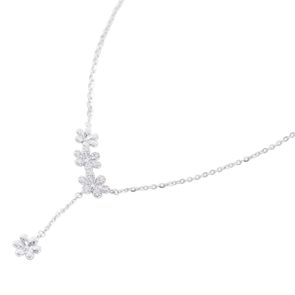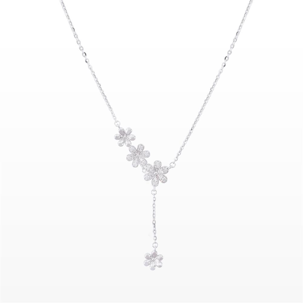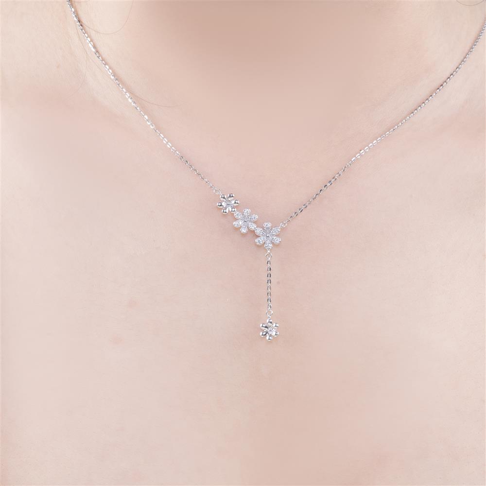 Dây chuyền kim cương với những đóa hoa nhỏ khẽ nở dọc theo đường vòng cổ, tựa như những cánh hoa đang chạm nhẹ vào làn gió sớm. Ba bông hoa lấp lánh nối nhau, để rồi một bông rũ xuống tinh tế, tạo nên nhịp chuyển động mềm mại và đầy nữ tính.
