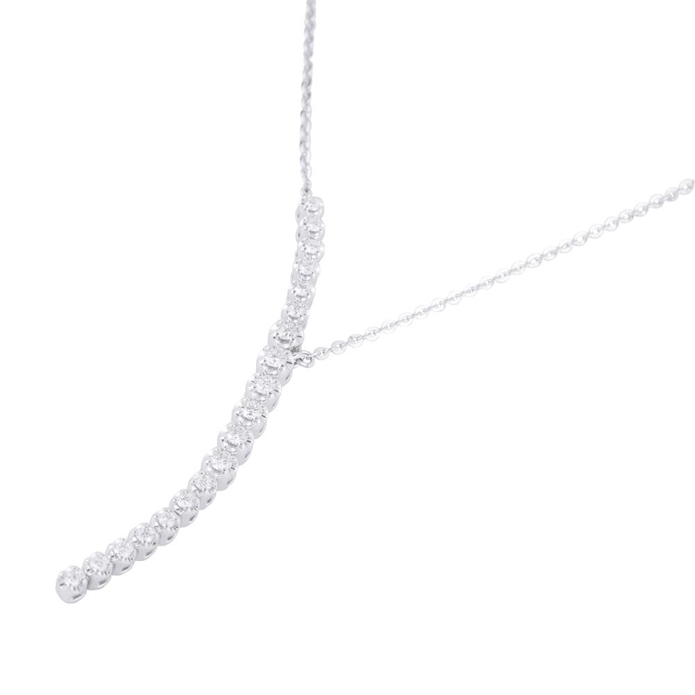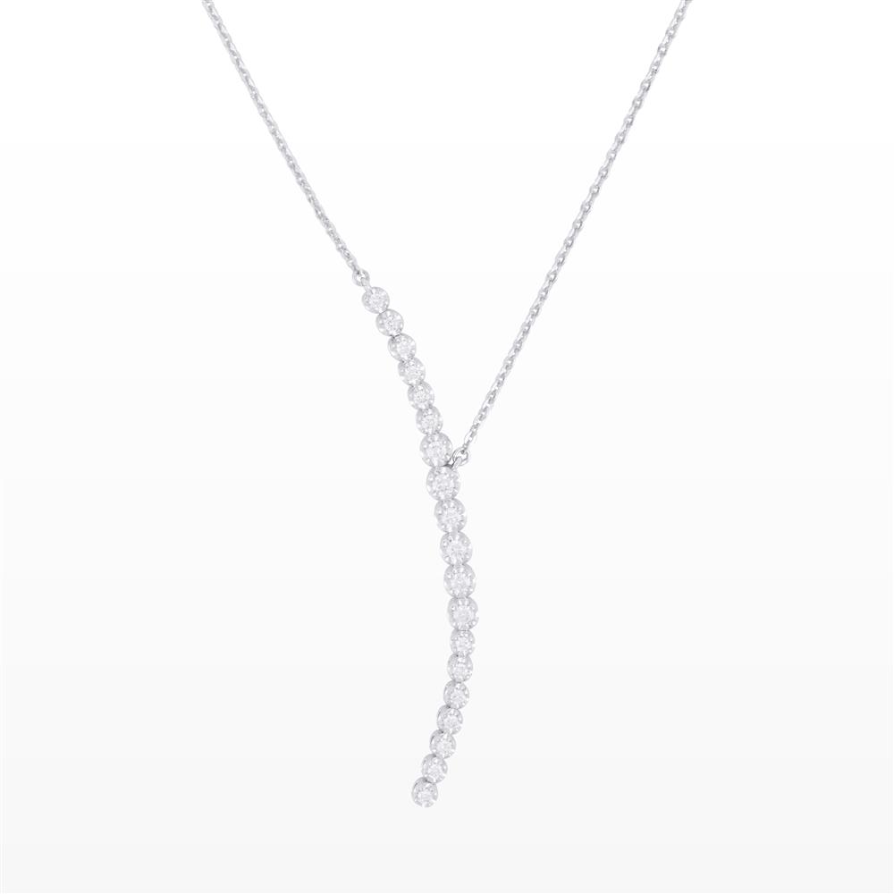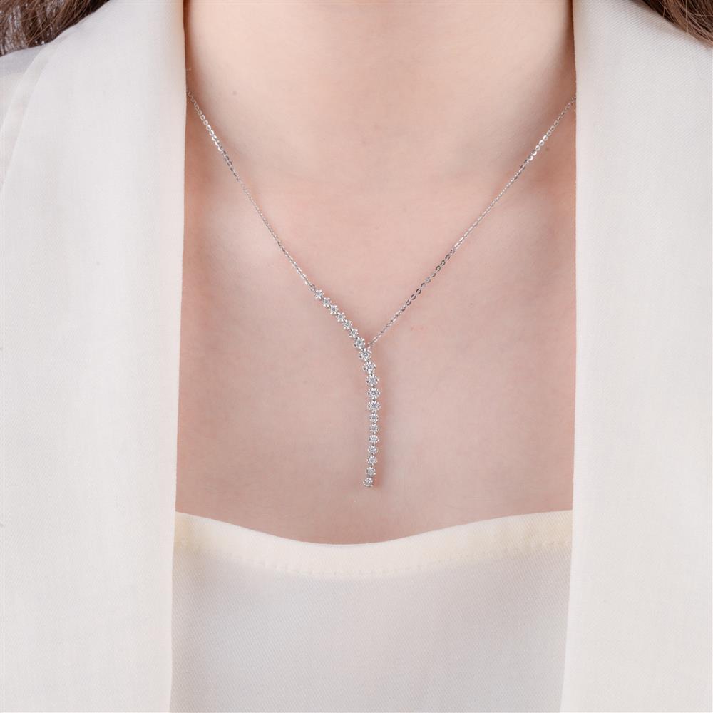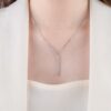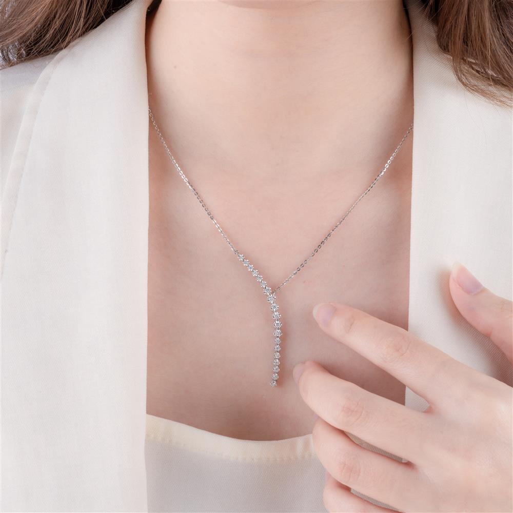 Dây cổ kim cương cao cấp với thiết kế tinh tế, điểm nhấn là chuỗi kim cương lấp lánh xếp hình dạng “V” mềm mại, giúp tôn lên vẻ đẹp thanh thoát của người đeo