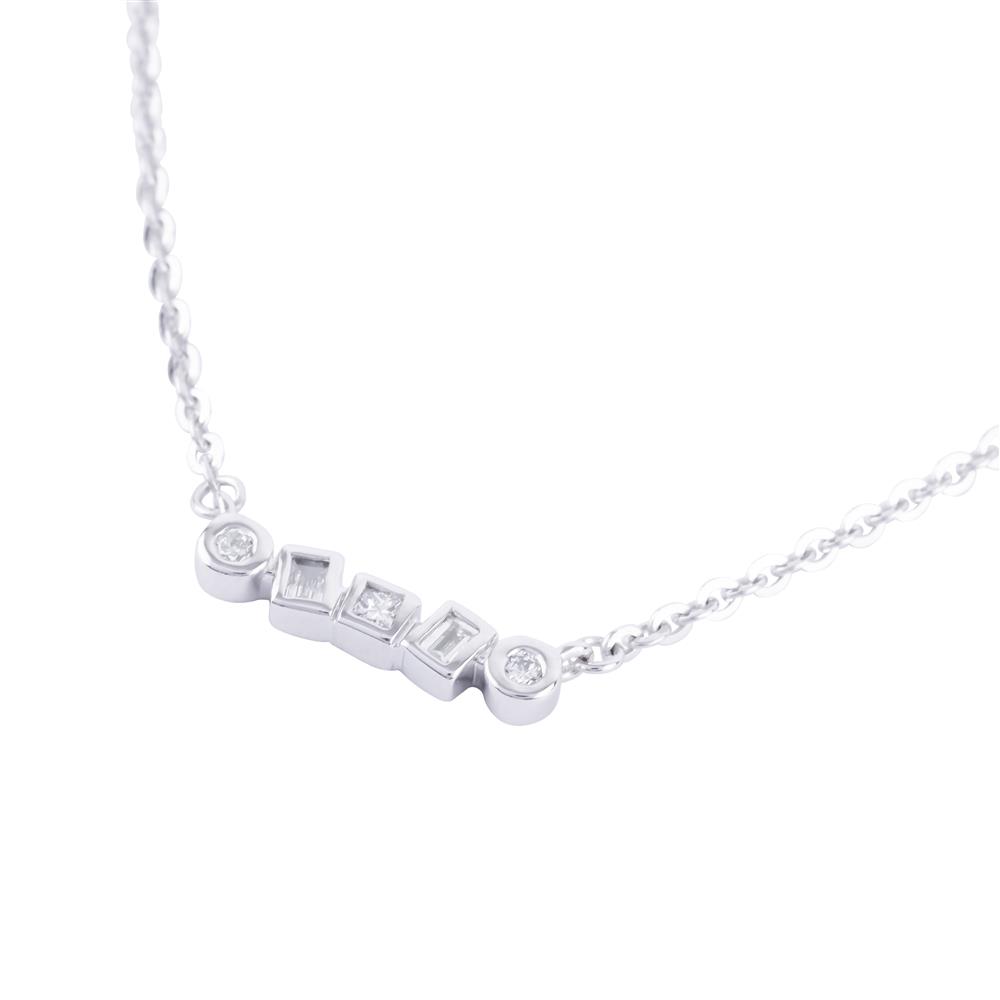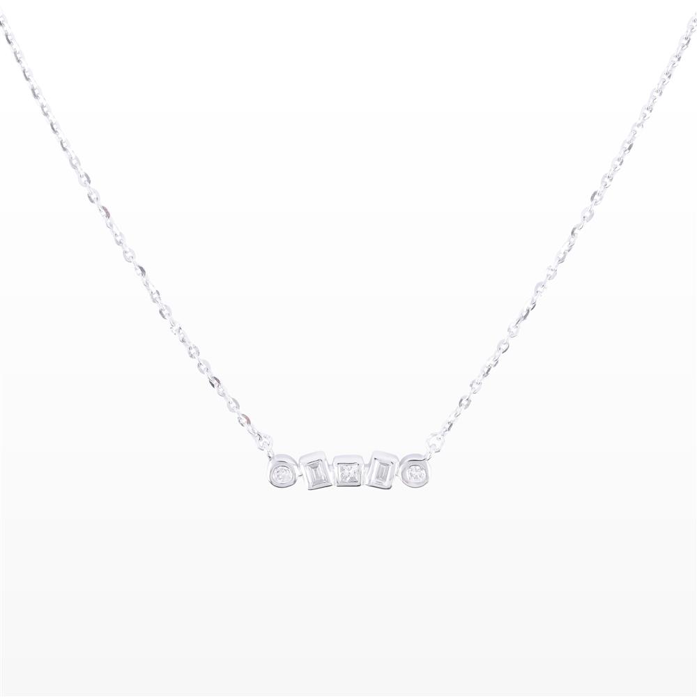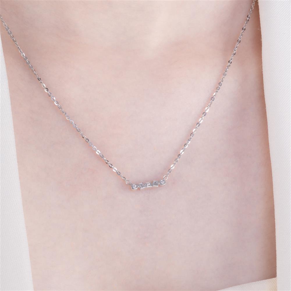 Tinh tế và hiện đại, dây chuyền vàng trắng nổi bật với 5 viên kim cương đa giác được sắp đặt xen kẽ hài hòa. Thiết kế tối giản nhưng sang trọng, phù hợp cho cả trang phục thường ngày lẫn những dịp đặc biệt, tôn lên vẻ đẹp thanh lịch và đẳng cấp.