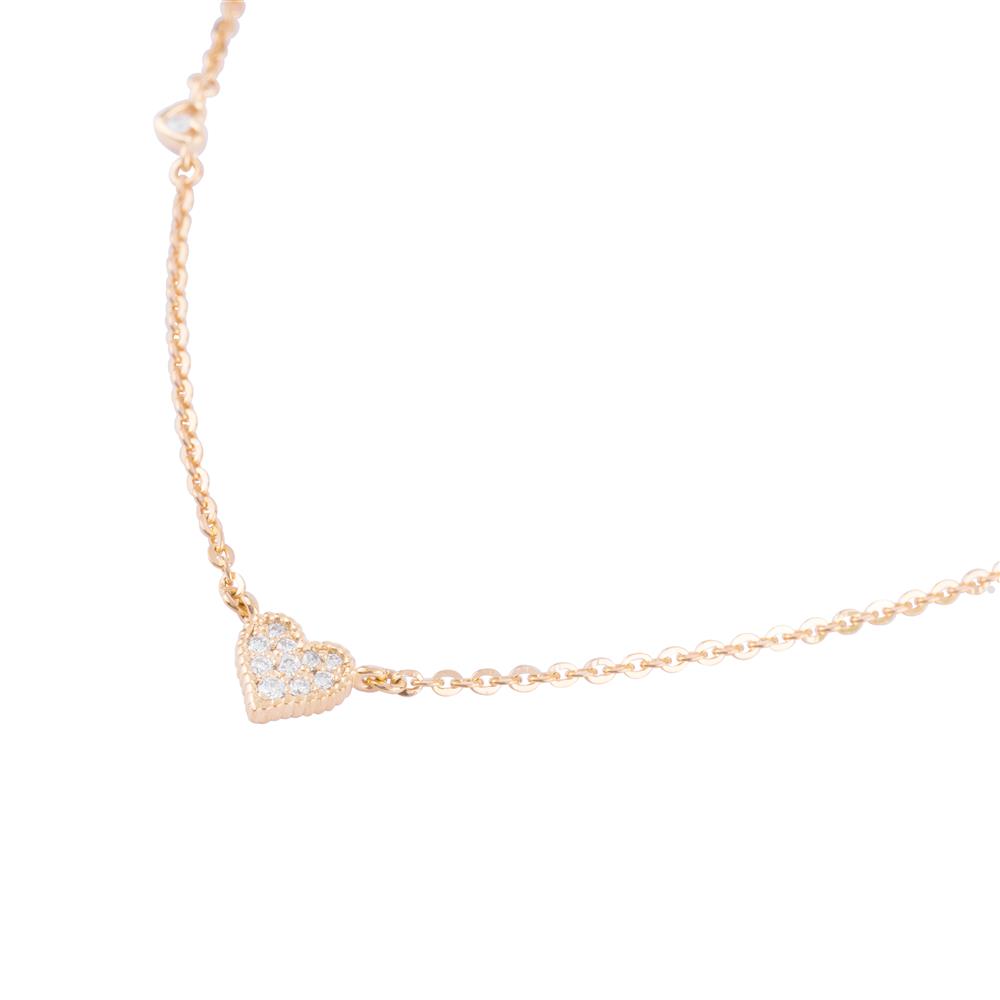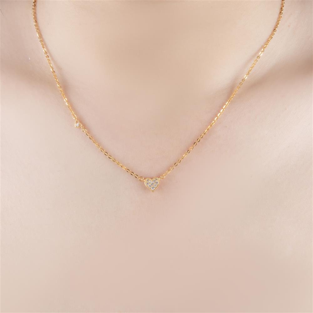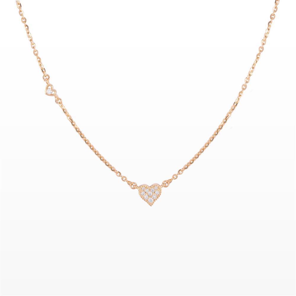 Dây chuyền được thiết kế thanh mảnh với mặt trái tim nhỏ xinh đính kim cương tấm, tạo hiệu ứng lấp lánh tinh tế và đầy nữ tính. Sắc vàng hồng ấm áp kết hợp cùng ánh sáng kim cương mang đến vẻ đẹp dịu dàng, ngọt ngào nhưng vẫn giữ được sự sang trọng cần có.