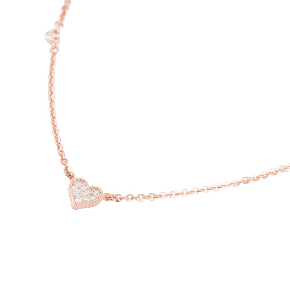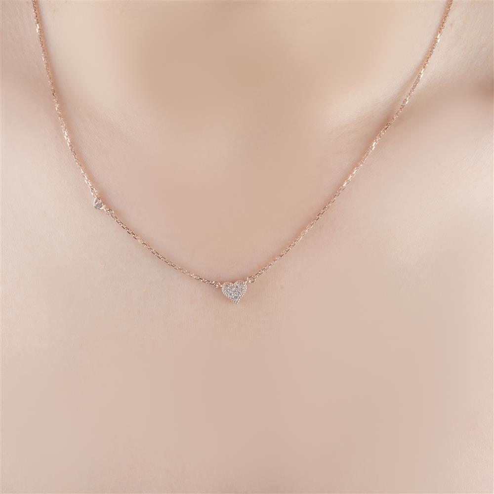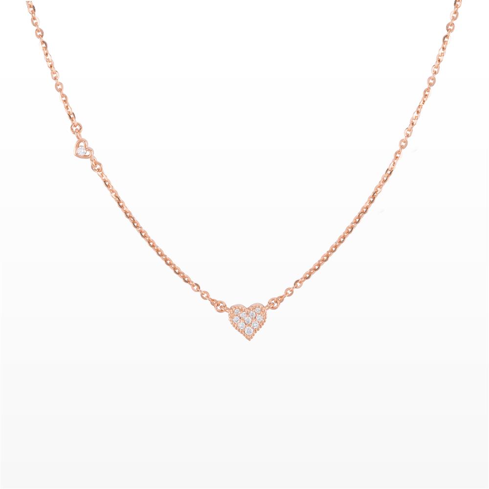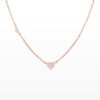 Dây chuyền được thiết kế với sợi dây vàng hồng thanh mảnh, kết hợp mặt trái tim nhỏ xinh đính kim cương tấm, tạo hiệu ứng lấp lánh nhẹ nhàng và đầy nữ tính. Sắc vàng hồng ấm áp giúp tôn lên ánh sáng kim cương, mang đến vẻ đẹp dịu dàng nhưng vẫn sang trọng.