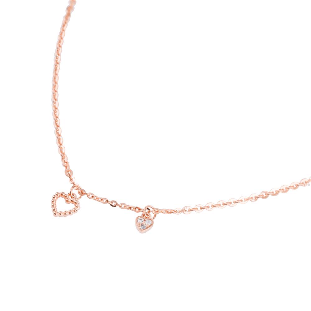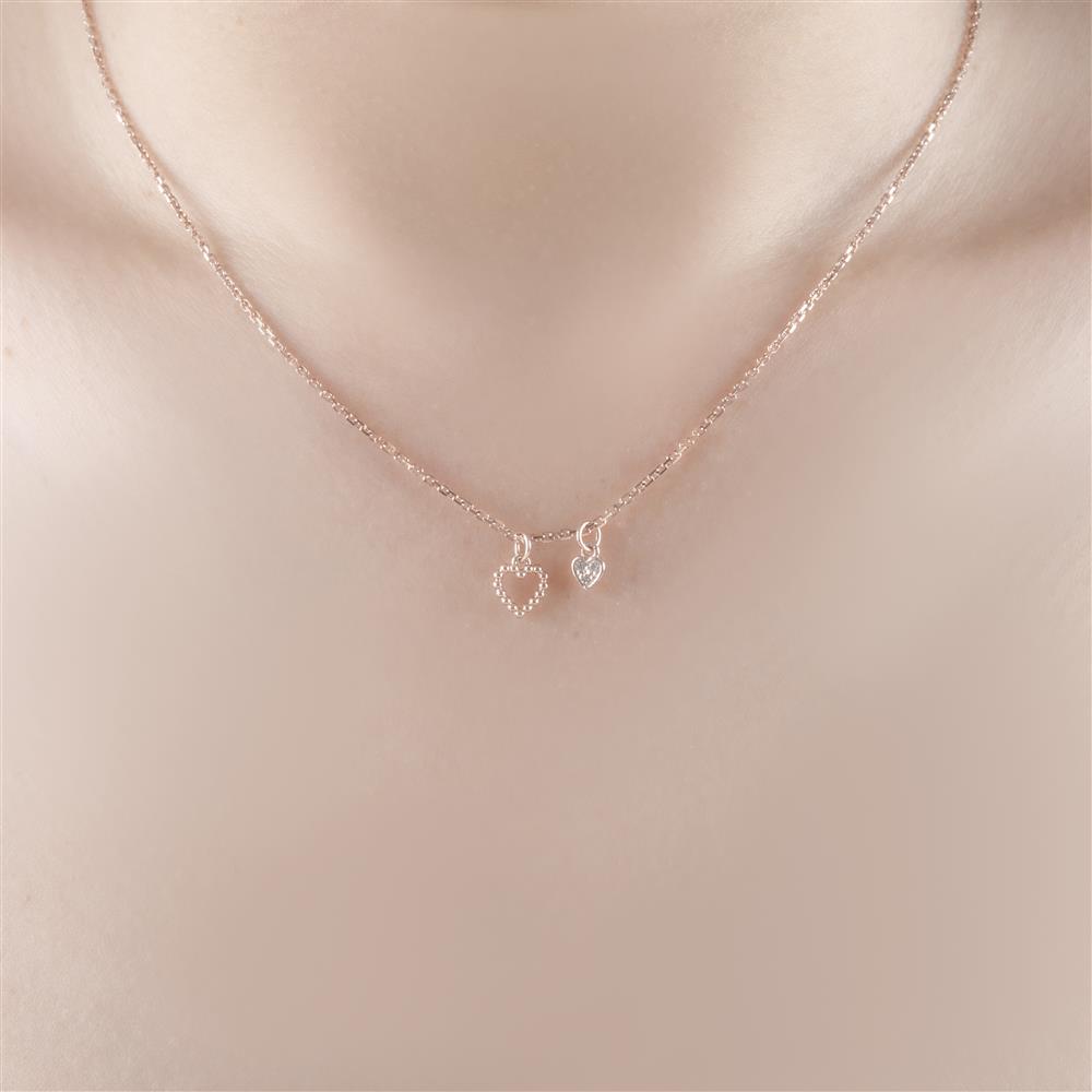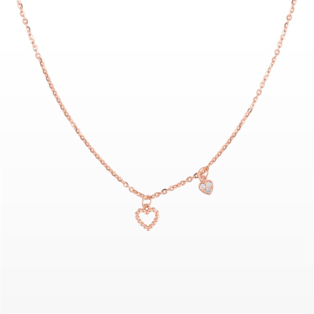 Dây chuyền được thiết kế với sợi dây vàng hồng thanh mảnh, điểm nhấn là hai charm trái tim treo lệch tinh tế, tạo cảm giác mềm mại và sinh động khi đeo. Một charm trái tim viền bi tạo hiệu ứng thủ công nhẹ nhàng, kết hợp cùng charm trái tim nhỏ đính kim cương, mang đến ánh lấp lánh dịu dàng và nữ tính.