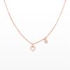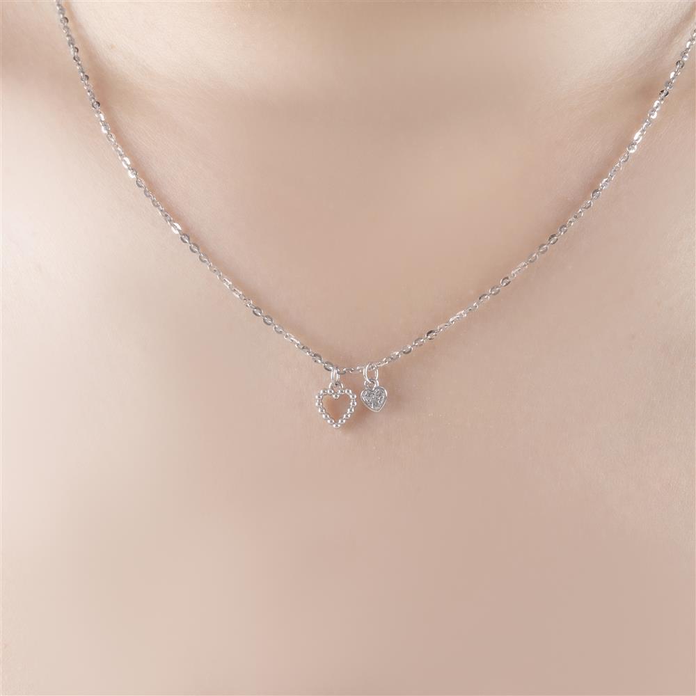 Dây chuyền được thiết kế với sợi dây mảnh nhẹ nhàng ôm sát cổ, mang lại cảm giác tinh tế và hiện đại. Điểm nhấn là hai charm trái tim treo lệch duyên dáng: một charm trái tim viền bi tạo hiệu ứng mềm mại, kết hợp cùng charm trái tim nhỏ đính kim cương, lấp lánh vừa đủ để thu hút ánh nhìn.