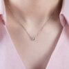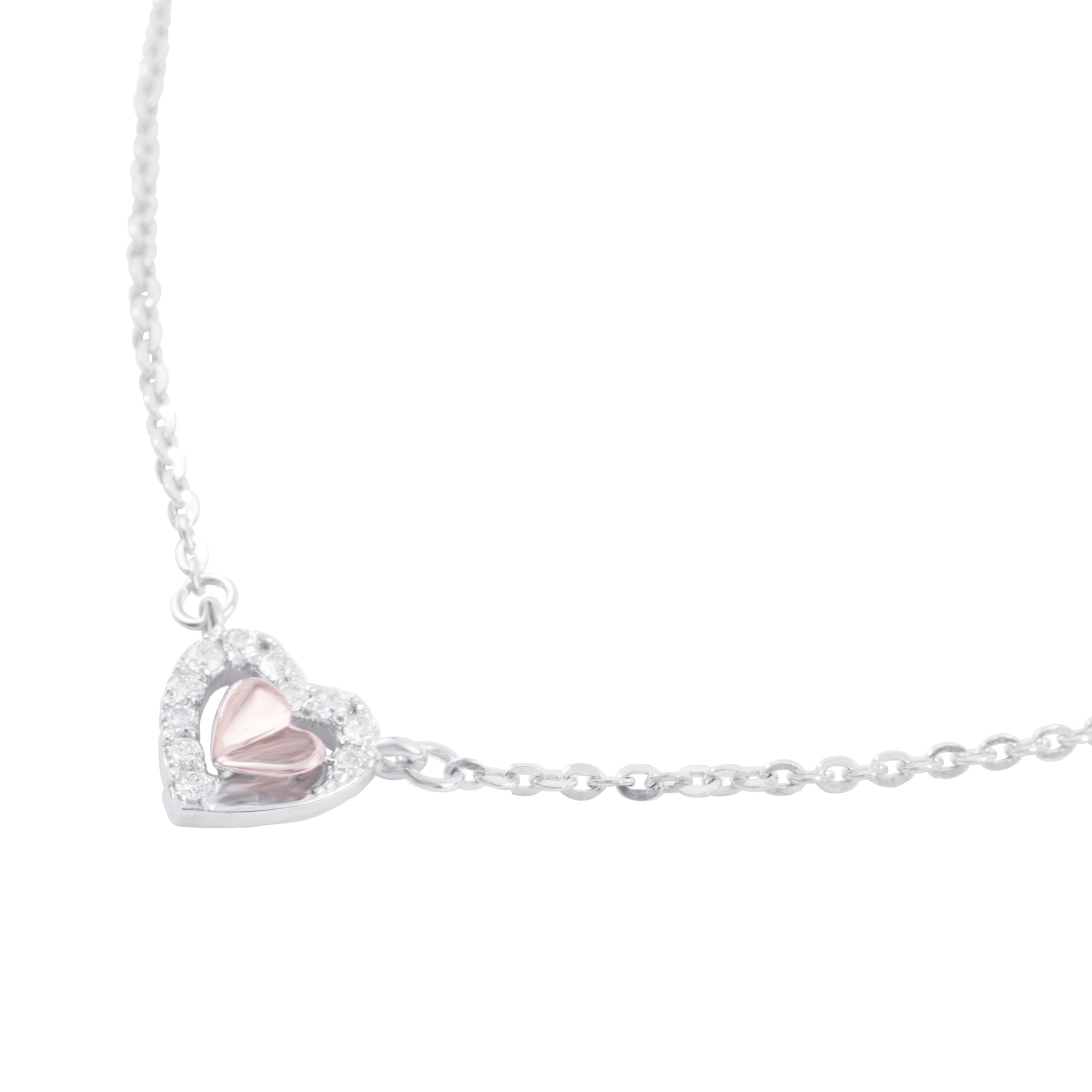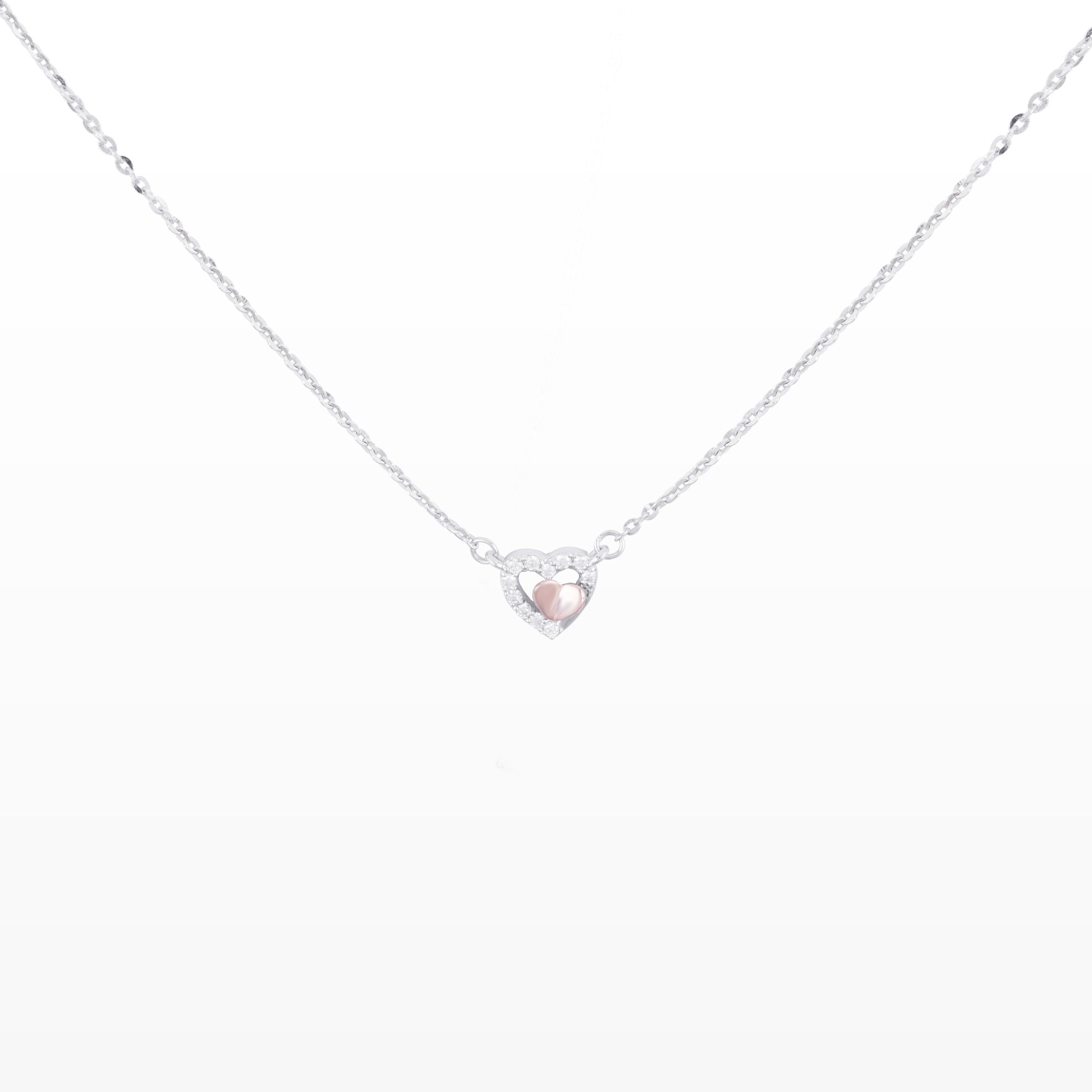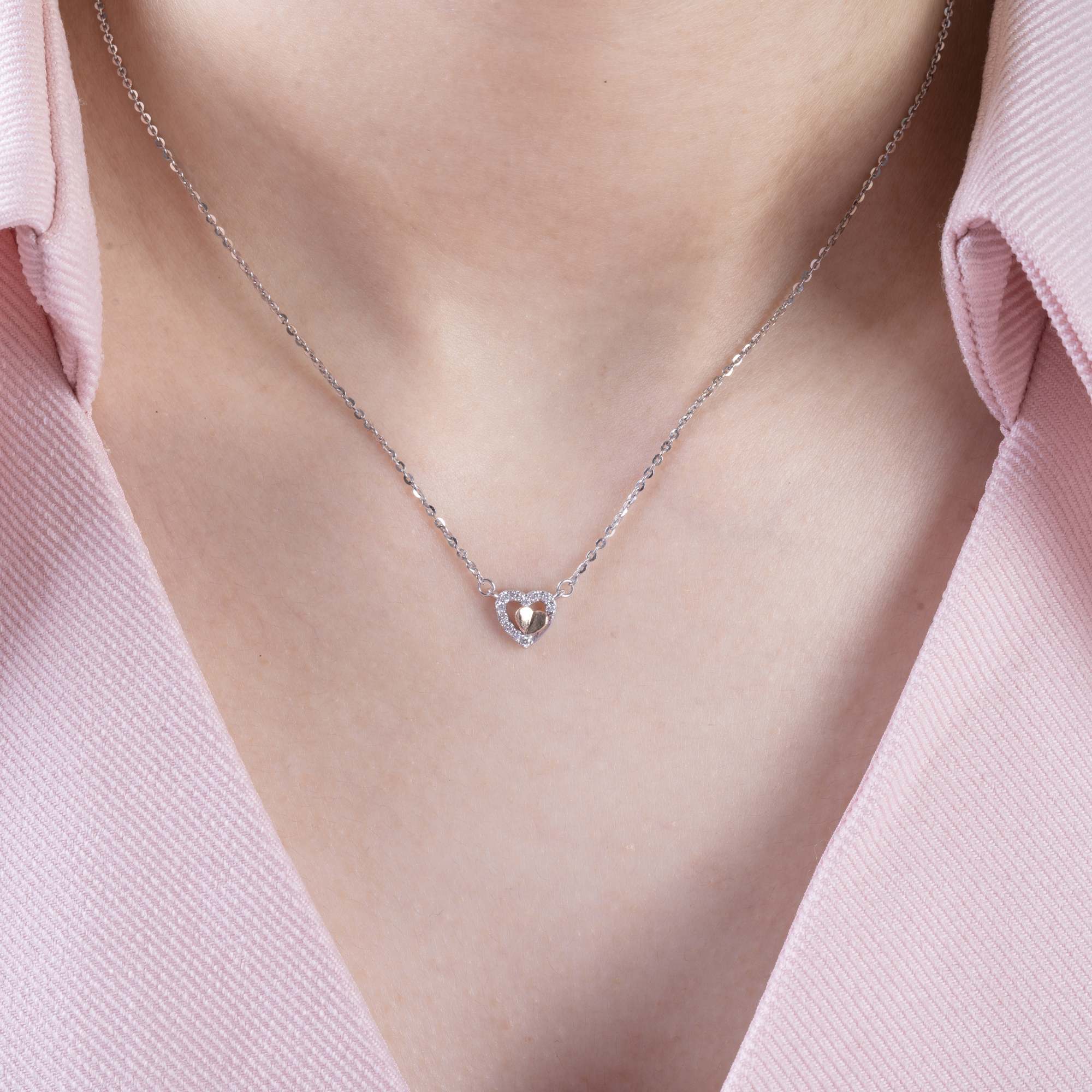 Chiếc dây chuyền kim cương mặt trái tim mang vẻ đẹp ngọt ngào và đầy cảm xúc. Thiết kế trái tim kép tinh tế, với phần viền đính kim cương lấp lánh ôm trọn trái tim hồng dịu dàng bên trong, như biểu tượng của tình yêu được nâng niu và gìn giữ.