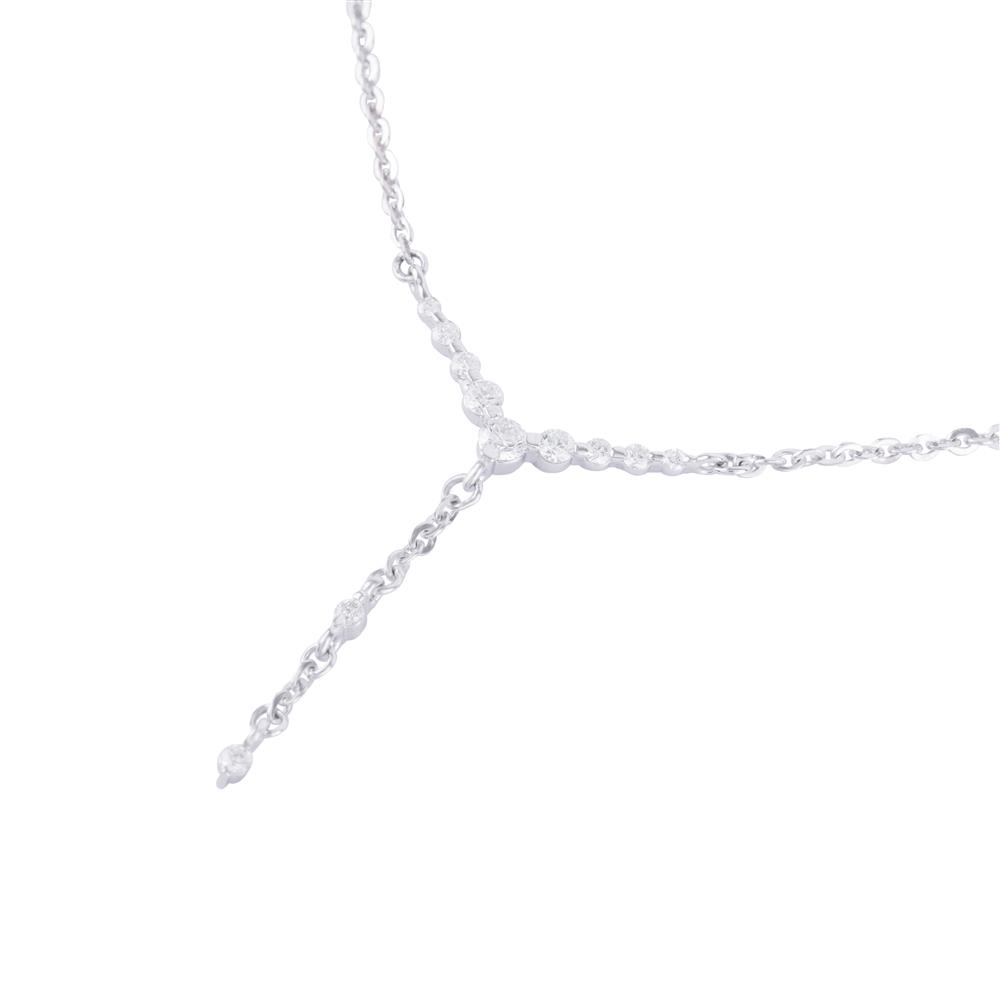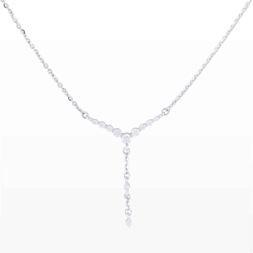 Tựa giọt sương khẽ rơi trên làn ánh sáng sớm, chiếc dây chuyền vàng trắng đính kim cương này mang đến cảm giác trong trẻo, thuần khiết và đầy sức hút. Mỗi viên kim cương nhỏ lấp lán hòa vào nhau thành bản giao hưởng của sự thanh lịch.