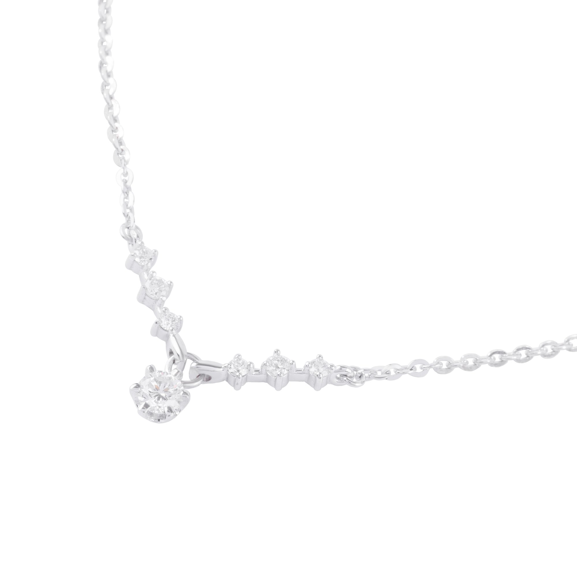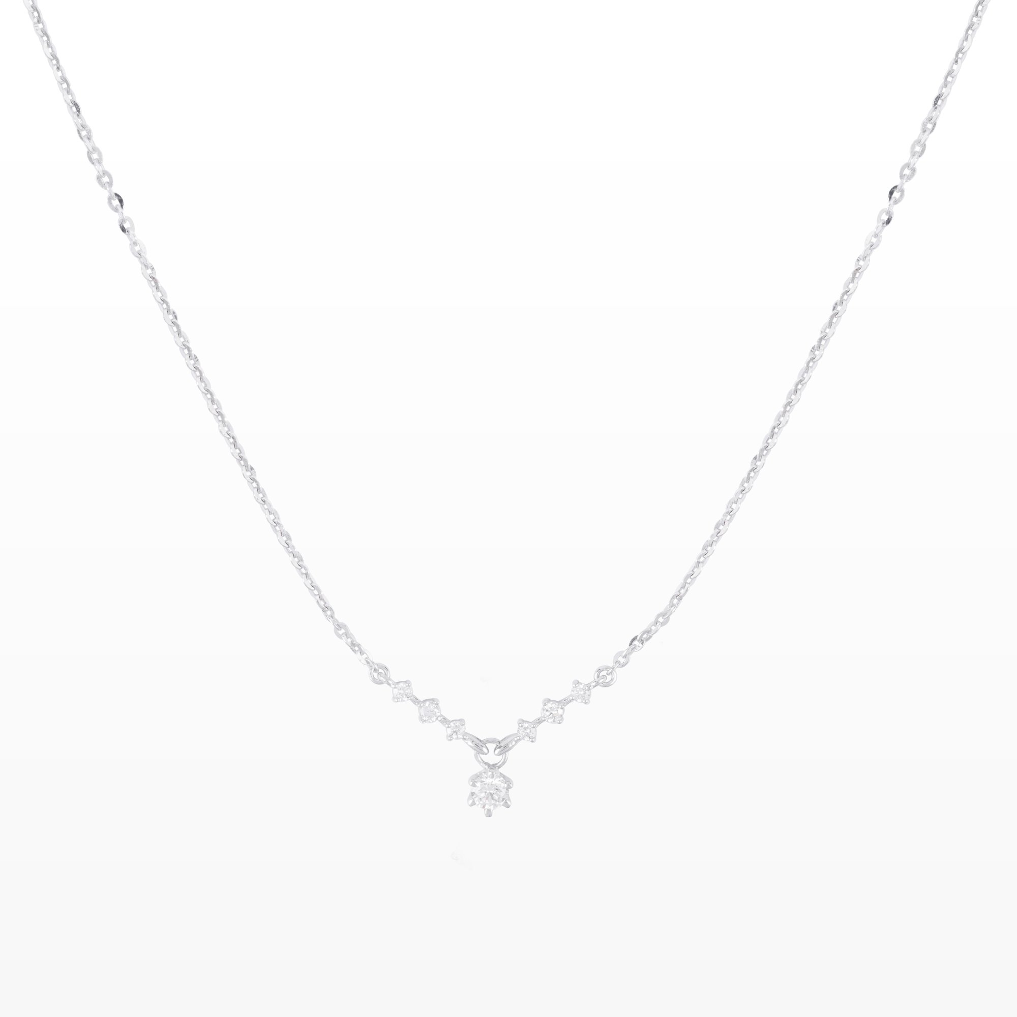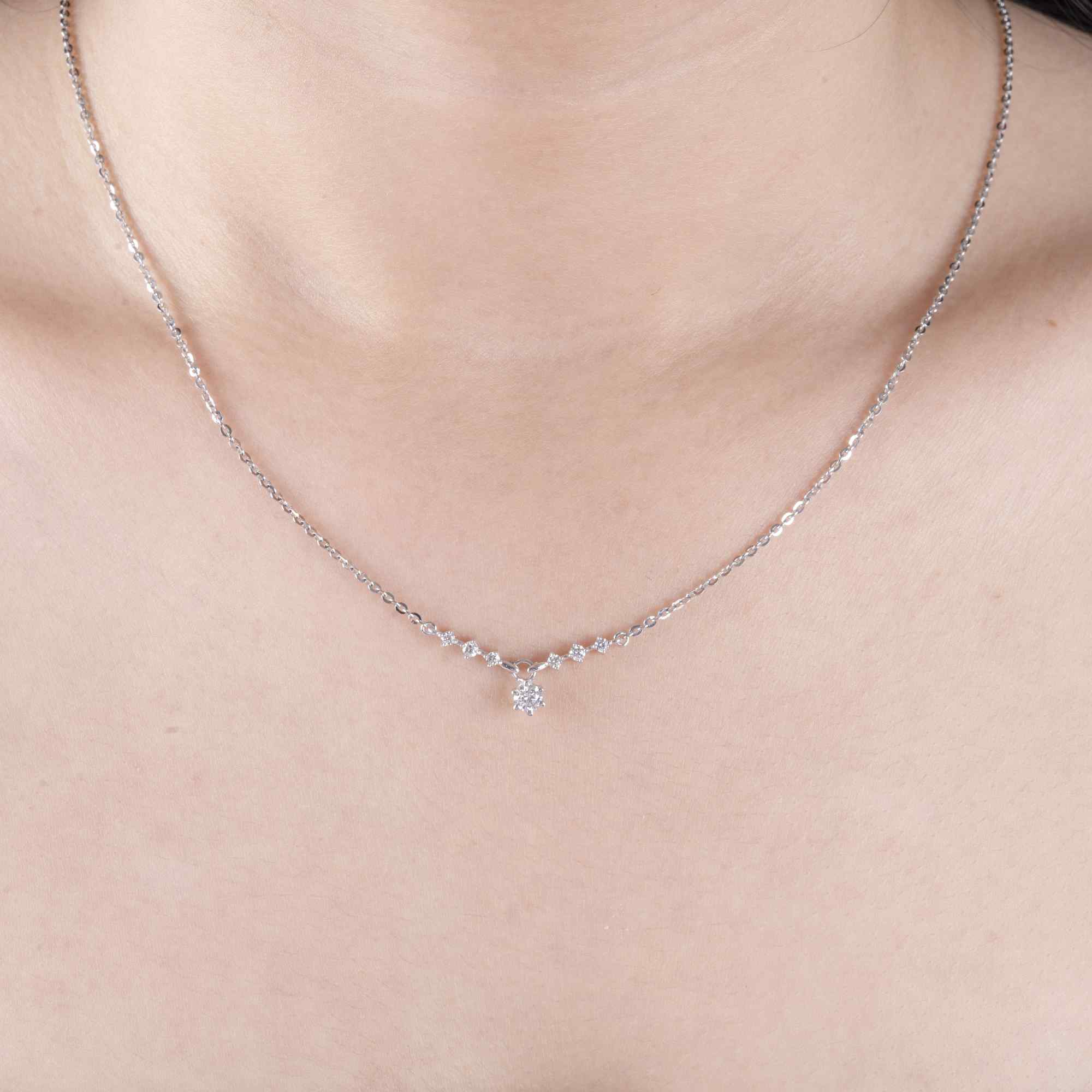 Thiết kế dây cổ thanh mảnh với những viên kim cương nhỏ xếp nối nhẹ nhàng, điểm nhấn viên kim cương chủ rủ tinh tế như một nhịp cảm xúc khẽ rung bên tim. Ánh sáng lấp lánh vừa đủ, tôn lên vẻ đẹp dịu dàng và nữ tính – phù hợp để đeo mỗi ngày hay trong những khoảnh khắc đặc biệt.