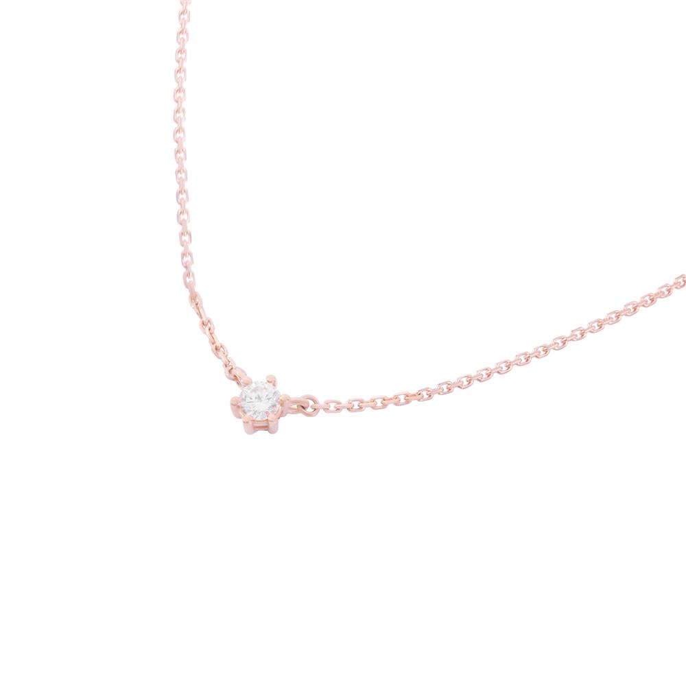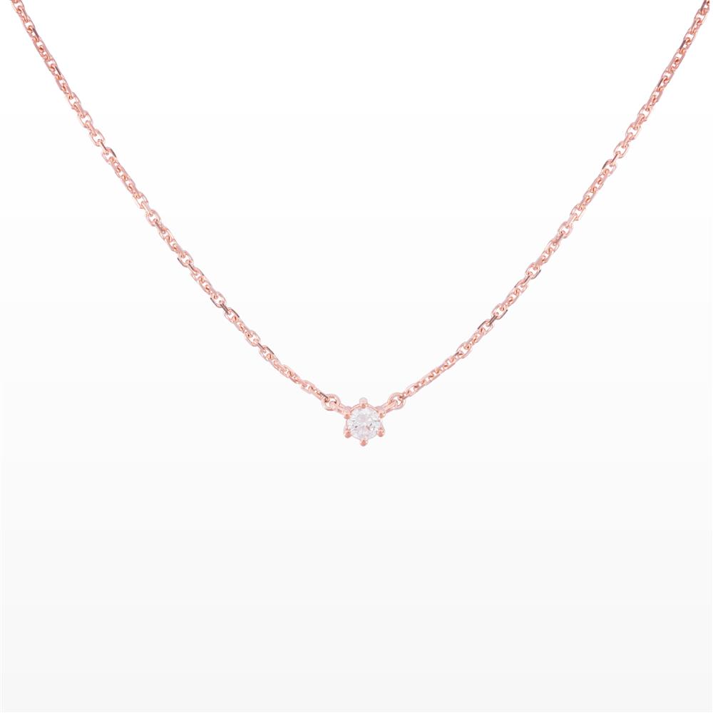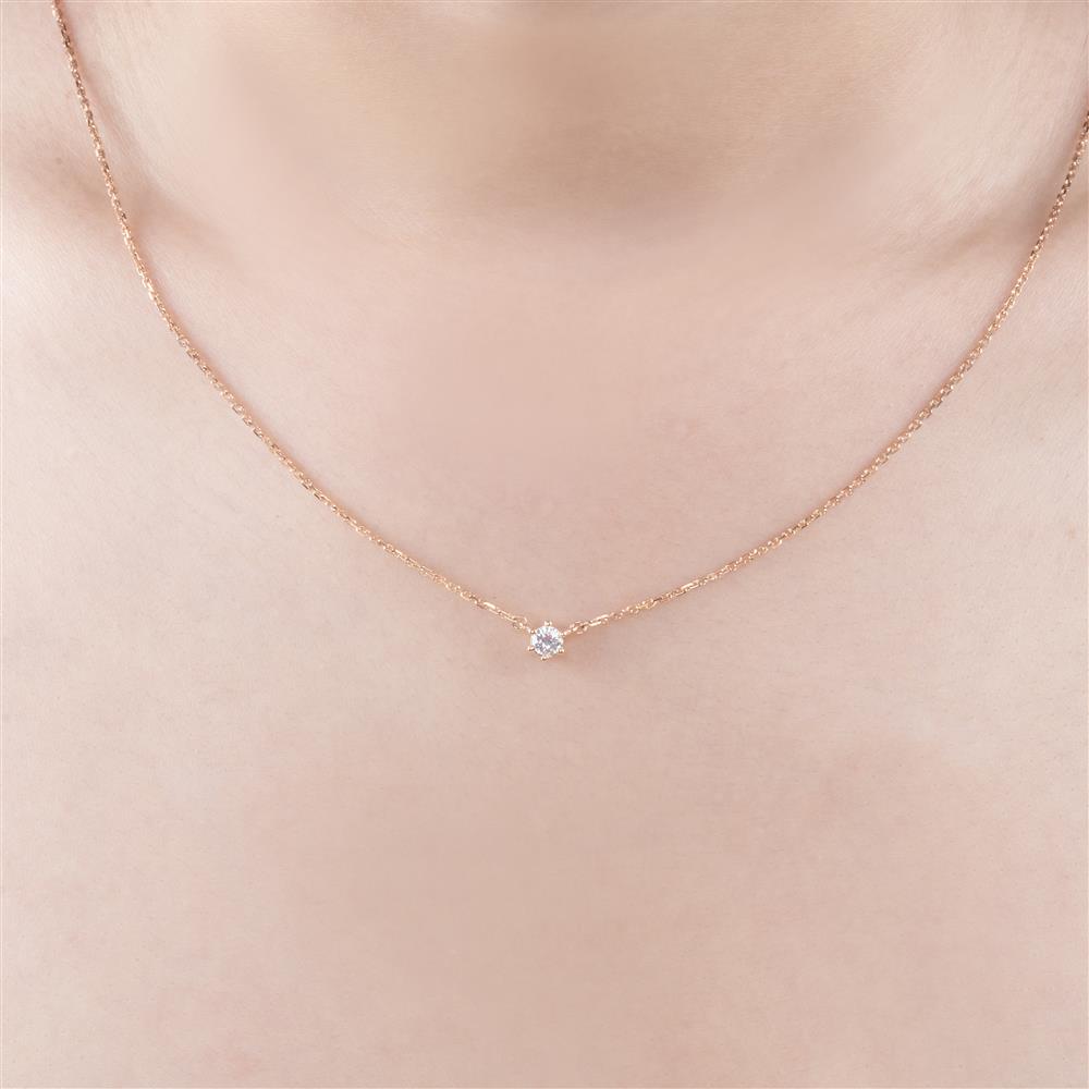 Một chiếc dây chuyền mảnh mai khoác sắc vàng hồng dịu ngọt, ôm nhẹ lấy cổ như một vệt nắng sớm. Viên kim cương đơn lấp lánh nằm ở vị trí thanh tú nhất, tỏa ra ánh sáng trong veo như giọt sương đầu ngày.