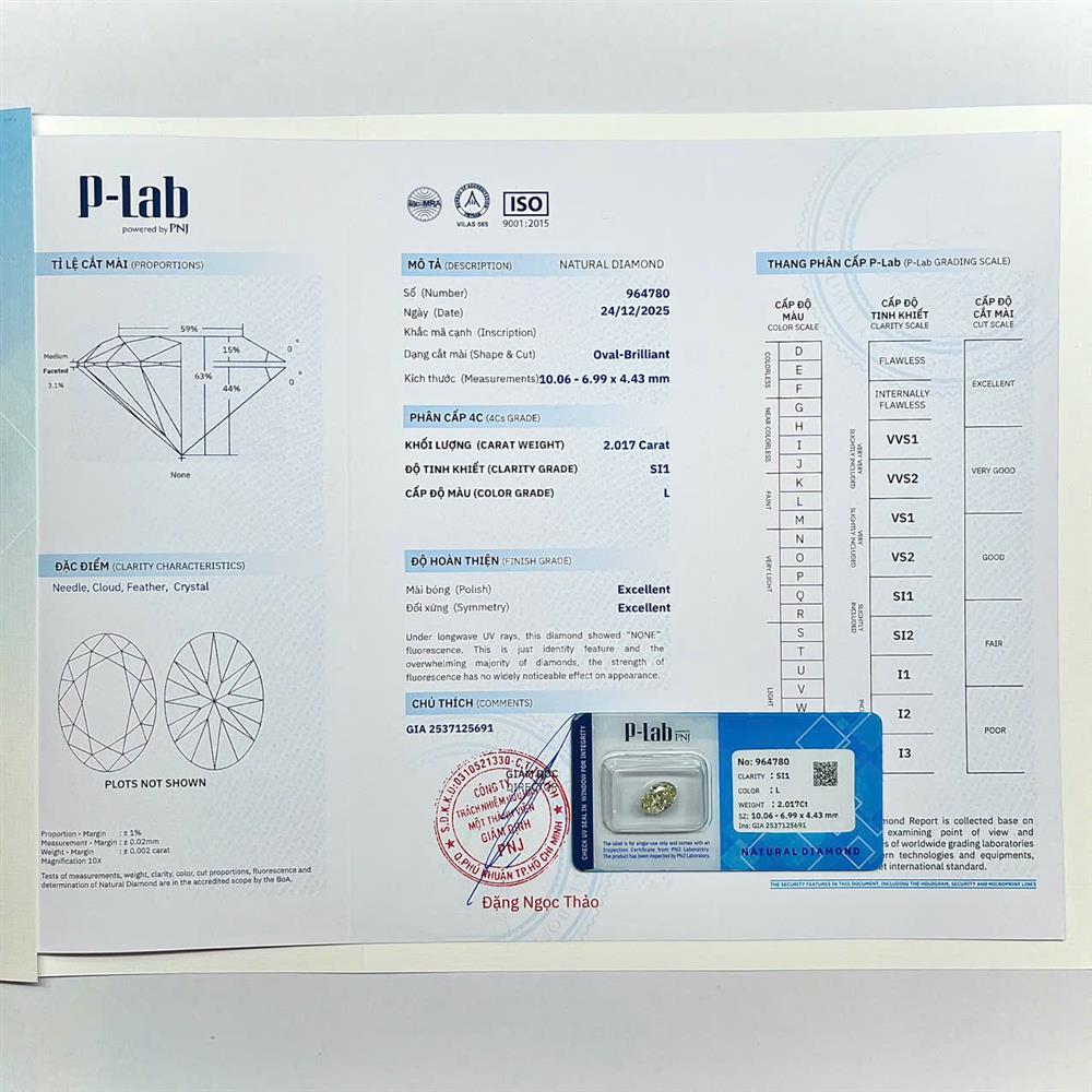 Viên kim cương Oval 10.0–6.9LY sở hữu dáng thuôn dài thanh lịch, giúp tối ưu hiệu ứng thị giác và tạo cảm giác viên đá lớn, nổi bật trên tay. Nước màu L mang sắc ấm nhẹ, hài hòa khi phối cùng vàng hoặc vàng hồng. Độ tinh khiết SI1 đảm bảo độ sáng tốt, phù hợp cho trang sức thiết kế sang trọng, cá tính và có điểm nhấn riêng.
