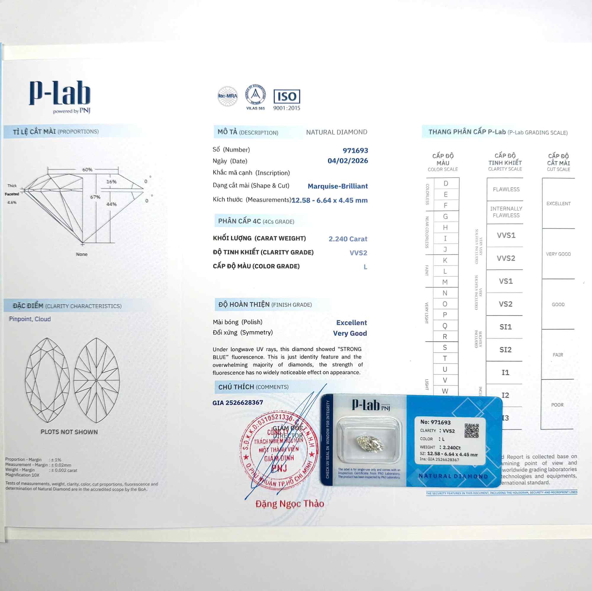 Viên kim cương MARQUISE 12.5–6.6LY L/VVS2 mang sắc trắng ấm cùng độ tinh khiết cao, cho bề mặt trong và ánh phản chiếu rõ. Kích thước lớn tạo điểm nhấn ấn tượng, kết hợp dáng marquise thon dài giúp tổng thể trang sức trở nên thanh thoát. Phù hợp chế tác nhẫn solitaire hoặc mặt dây chuyền, với thiết kế tối giản để tôn viên chủ.