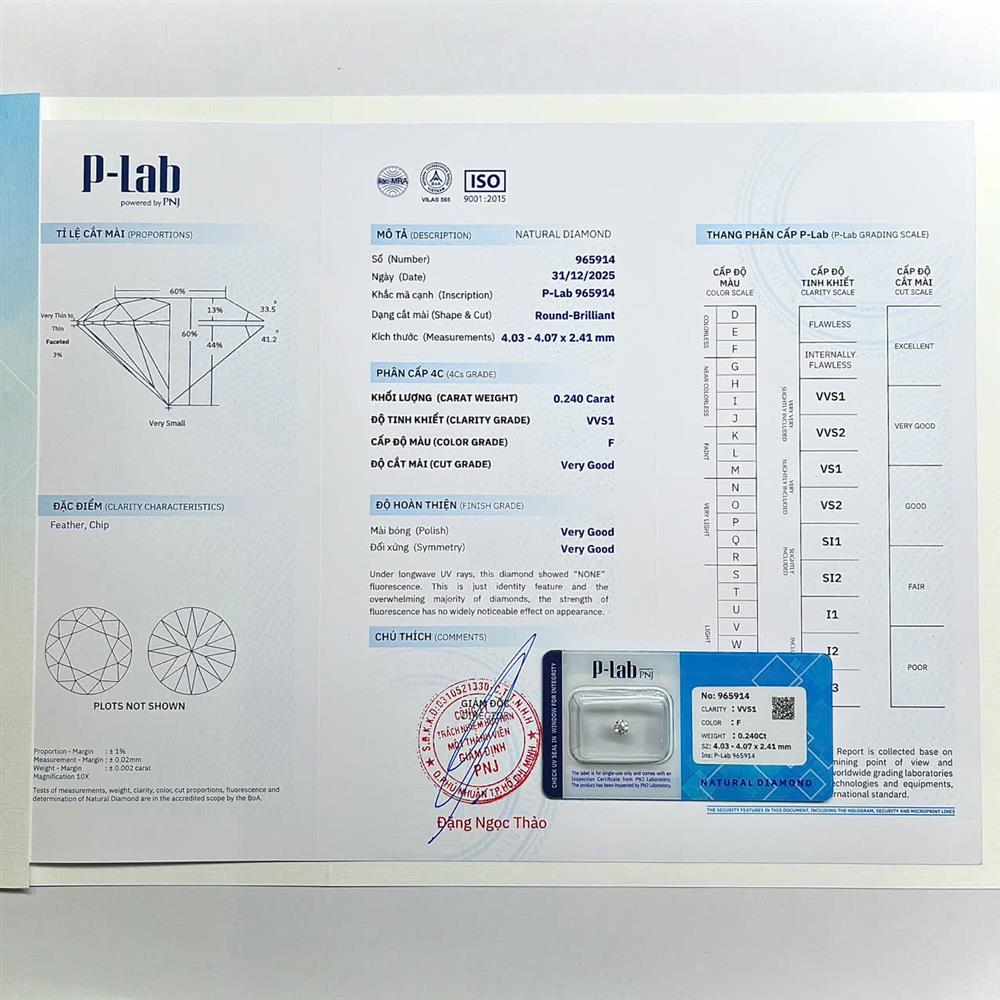 Viên kim cương 4.0LY mang sắc F trắng sáng, tạo cảm giác tinh tế và sang trọng khi quan sát. Độ tinh khiết VVS1 cho thấy các bao thể cực kỳ nhỏ, gần như không thể nhận biết, giúp viên đá đạt độ trong vượt trội và khả năng phản xạ ánh sáng ấn tượng. Phù hợp cho trang sức cao cấp.