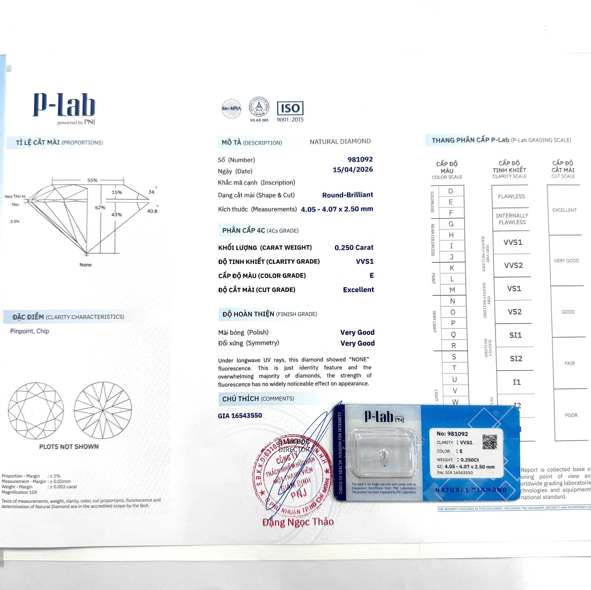 Viên kim cương 4.0LY E/VVS1 mang vẻ đẹp thanh khiết với sắc trắng tinh tế và độ tinh khiết gần như hoàn hảo, tạo nên hiệu ứng ánh sáng rực rỡ, trong trẻo đầy cuốn hút. Từng giác cắt phản chiếu ánh sáng mềm mại nhưng sắc nét. Lý tưởng chế tác nhẫn solitaire, dây chuyền hoặc hoa tai thiết kế tối giản, tôn vinh trọn vẹn viên chủ.