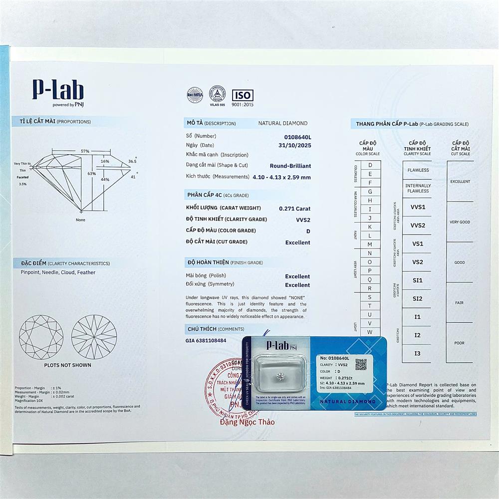 Viên kim cương 4.1LY D/VVS2 sở hữu sắc trắng tinh khiết tuyệt đối cùng độ trong xuất sắc, mang ý nghĩa thuần khiết, sang trọng và chuẩn mực hoàn hảo. Kích thước nhỏ nhắn nhưng ánh sáng mạnh mẽ, rất phù hợp chế tác nhẫn thanh mảnh, mặt dây chuyền hoặc bông tai tối giản. Họa tiết nhẹ nhàng sẽ làm viên chủ nổi bật trọn vẹn vẻ đẹp tinh tế và rực rỡ.