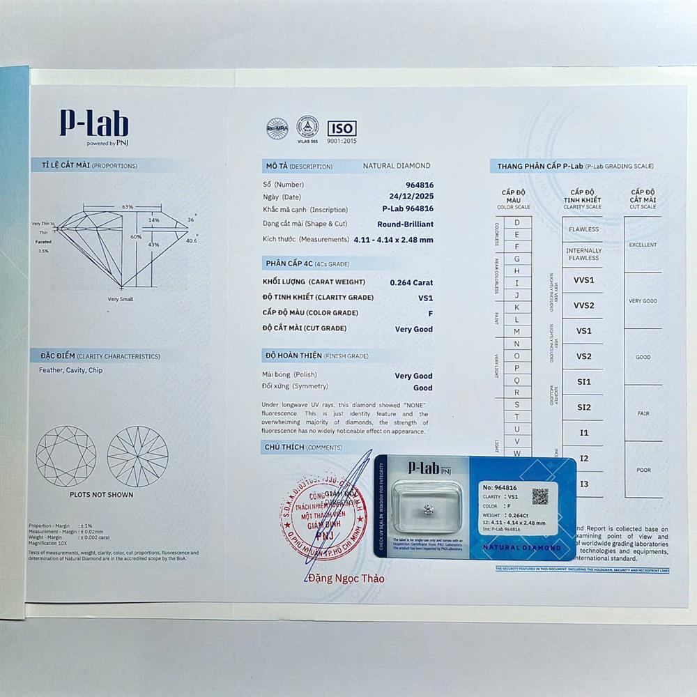 Viên kim cương 4.1LY sở hữu sắc trắng F hài hòa, mang lại độ sáng dịu và ánh lửa ổn định. Độ tinh khiết VS1 cho thấy rất ít bao thể, khó nhận thấy khi quan sát bằng mắt thường, đảm bảo vẻ đẹp cân đối và tinh tế. Phù hợp chế tác trang sức thanh lịch, dễ ứng dụng và giữ giá trị lâu dài.