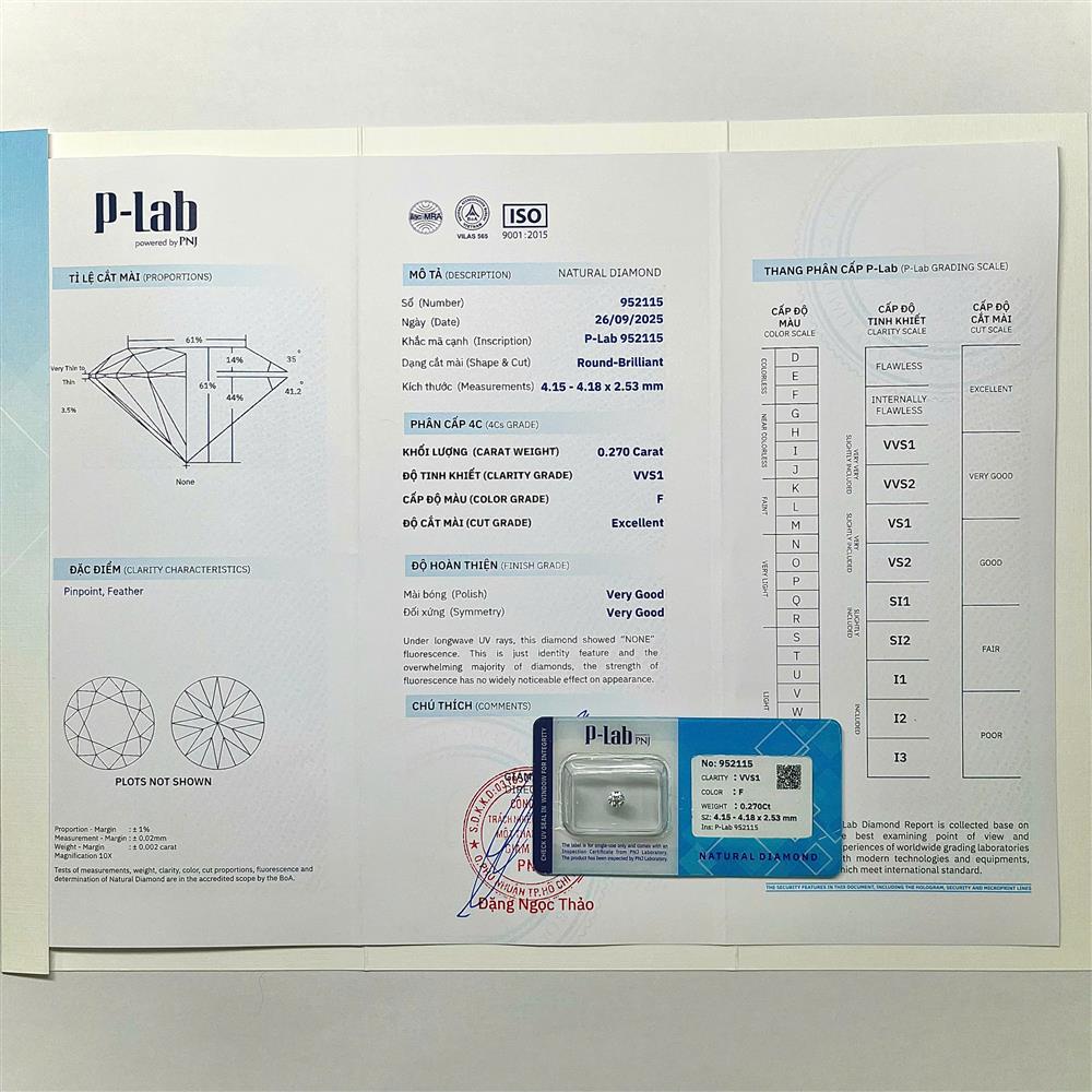 Viên kim cương tròn 4.1 ly, nước F và độ tinh khiết VVS1 mang nét đẹp nhẹ nhàng, tinh khôi và thanh lịch. Phù hợp để chế tác nhẫn nữ thanh mảnh, nhẫn layering hoặc bông tai nhỏ. Nên chọn thiết kế tối giản, tinh tế để làm nổi bật độ sáng và trong suốt tự nhiên của viên chủ.