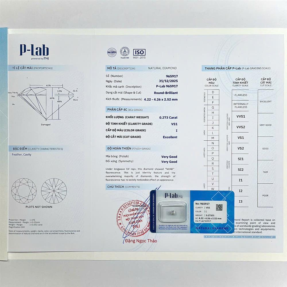 Viên kim cương 4.2LY mang sắc I nhẹ ấm, tạo cảm giác tự nhiên và dễ ứng dụng trong nhiều phong cách trang sức. Độ tinh khiết VS1 đảm bảo các bao thể rất nhỏ, khó nhận thấy bằng mắt thường, giữ được độ trong và độ lấp lánh ổn định. Phù hợp chế tác nhẫn hoặc mặt dây thanh lịch, tinh tế.