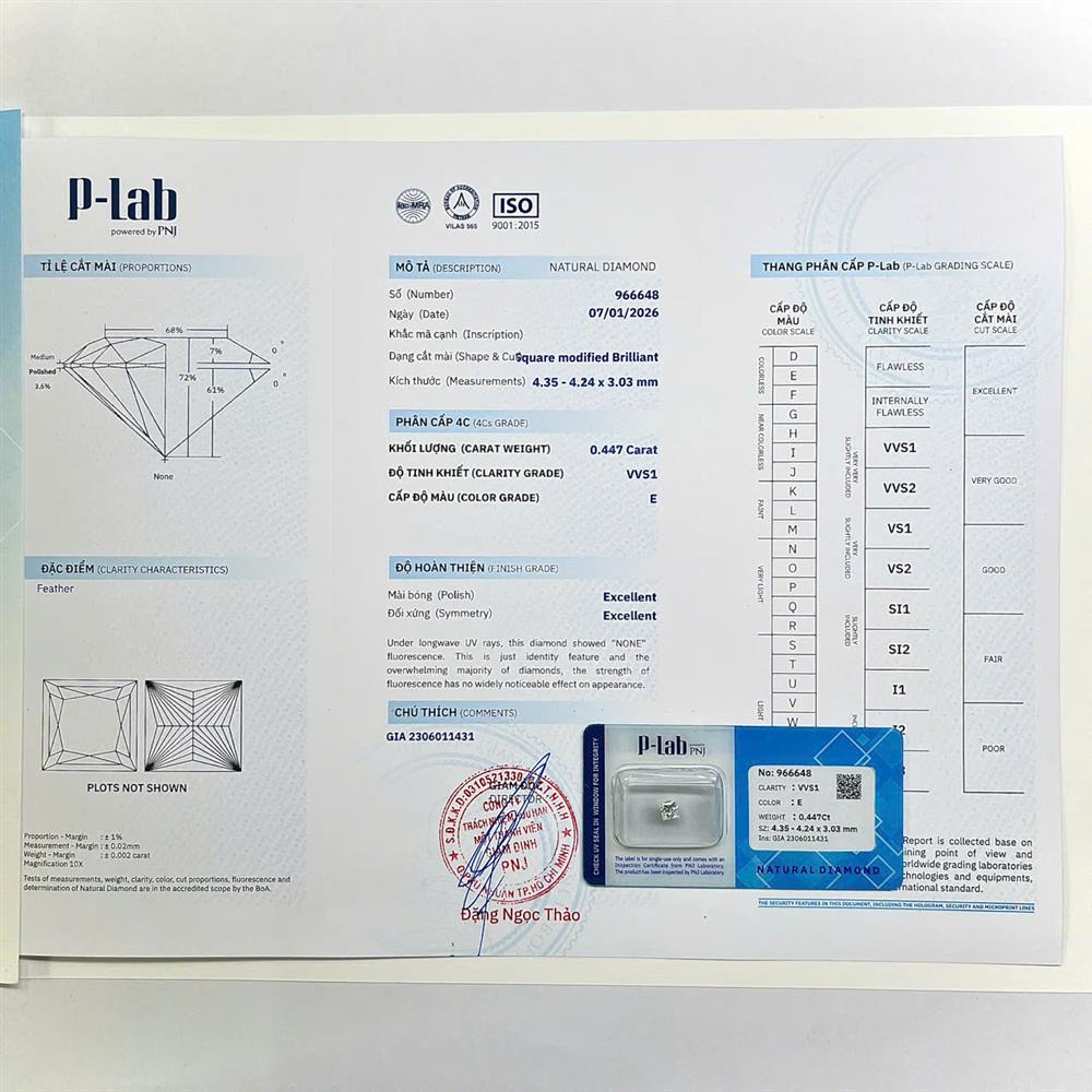 Viên kim cương 4.3-4.2LY sắc E gây ấn tượng với độ trắng sáng tinh khiết, mang lại cảm giác thanh lịch và đẳng cấp. Độ tinh khiết VVS1 cho cấu trúc gần như hoàn mỹ, giúp ánh lửa bật sáng rõ ràng, trong trẻo và cuốn hút. Rất lý tưởng để chế tác nhẫn hoặc mặt dây tinh giản, tôn vinh vẻ đẹp thuần khiết và gu thẩm mỹ tinh tế.