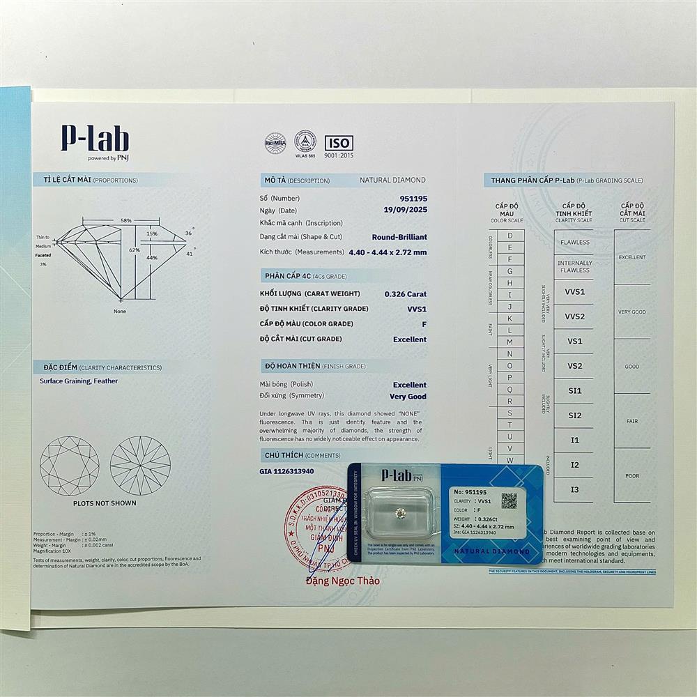 Viên kim cương tròn 4.4LY nước F, độ tinh khiết VVS1 mang vẻ đẹp thanh khiết, rực rỡ và tinh tế. Phù hợp để chế tác nhẫn đính hôn, mặt dây chuyền hoặc hoa tai sang trọng. Họa tiết đơn giản, tinh gọn giúp làm nổi bật ánh sáng lấp lánh và đường cắt hoàn hảo của viên chủ, tôn vinh vẻ đẹp sang trọng và quý phái.