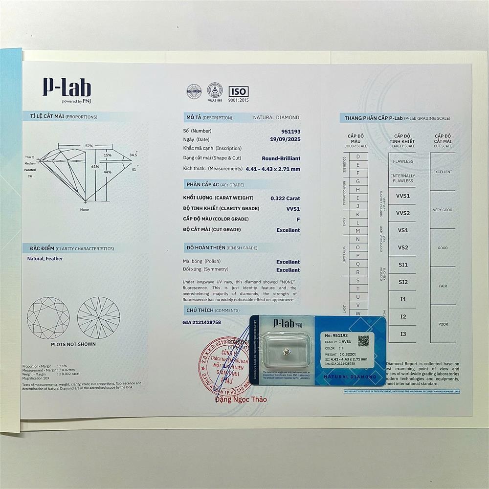 Viên kim cương tròn 4.40LY nước F, độ tinh khiết VVS1 toát lên vẻ đẹp hoàn hảo và rực rỡ. Phù hợp chế tác nhẫn đính hôn, mặt dây chuyền hoặc hoa tai tinh tế. Họa tiết đơn giản, tinh tế giúp làm nổi bật ánh sáng lấp lánh và đường cắt sắc nét của viên chủ, tôn vinh vẻ đẹp sang trọng và quý phái.