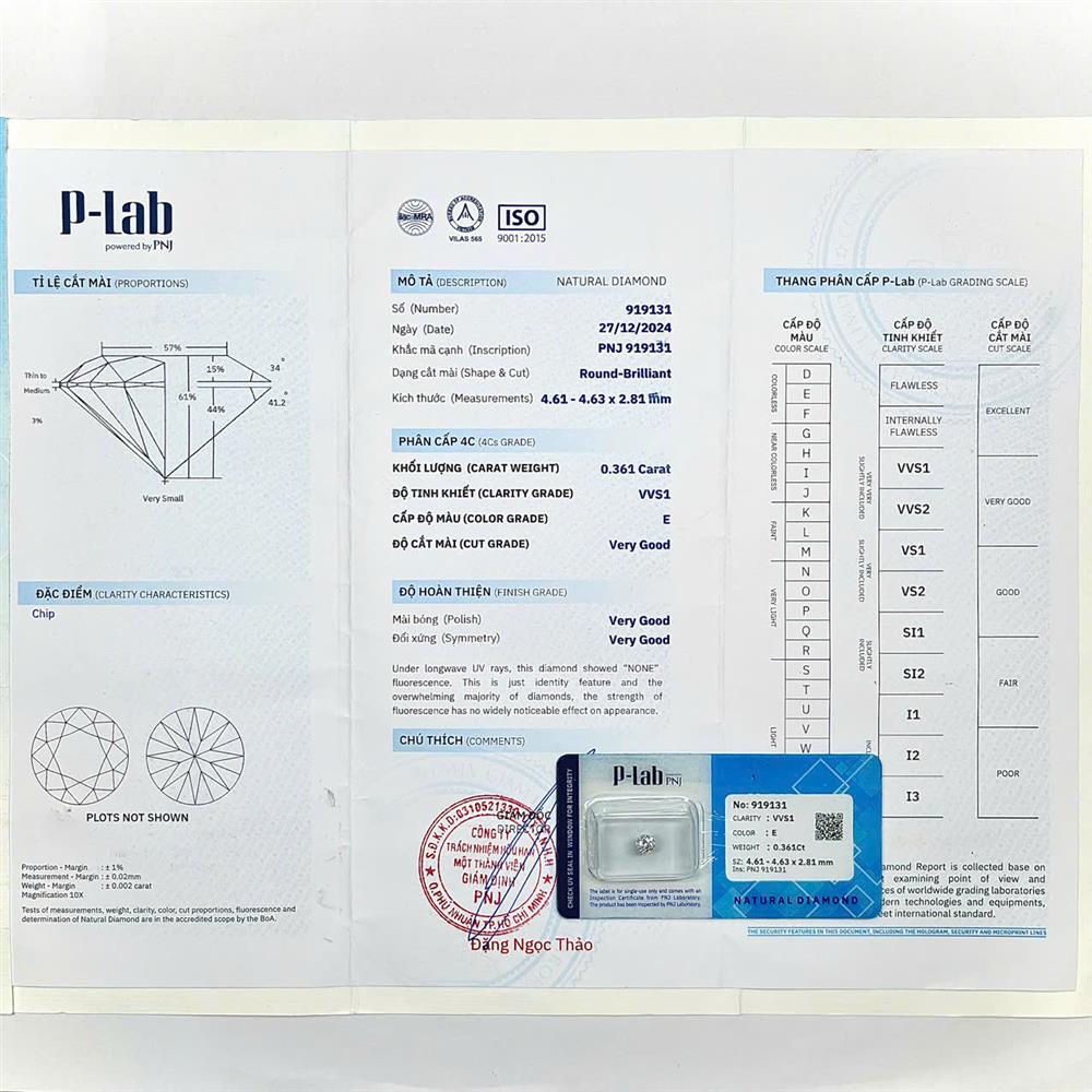Viên kim cương 4.6LY E/VVS1 mang vẻ sáng tinh khiết với ánh lửa rõ và gọn, tạo cảm giác sắc sảo nhưng rất hài hòa. Sắc trắng E đem lại phong thái hiện đại, còn độ tinh khiết VVS1 giúp ánh sáng lan tỏa sạch và đều. Khi kết hợp cùng thiết kế tối giản, viên chủ thể hiện nét thanh lịch chuẩn mực, nhẹ nhàng mà cuốn hút.