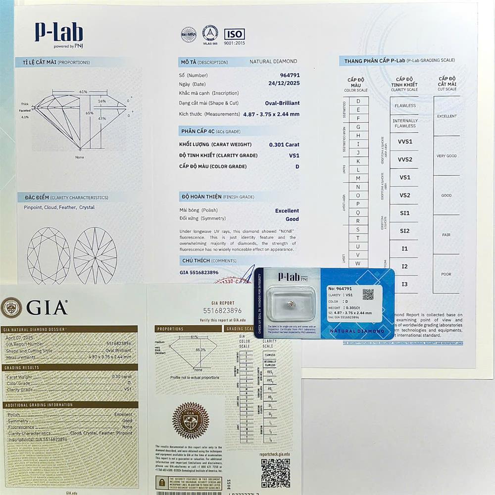 Viên kim cương dáng oval 4.8–3.7LY mang sắc D trắng tinh khiết, thuộc nhóm màu cao cấp nhất, tạo hiệu ứng ánh sáng rực rỡ và sang trọng. Độ tinh khiết VS1 giúp viên đá đạt độ trong ấn tượng, bao thể rất nhỏ, khó nhận biết. Phom oval mềm mại giúp tổng thể thanh thoát, tôn vẻ tinh tế khi gắn trên nhẫn hoặc mặt dây.