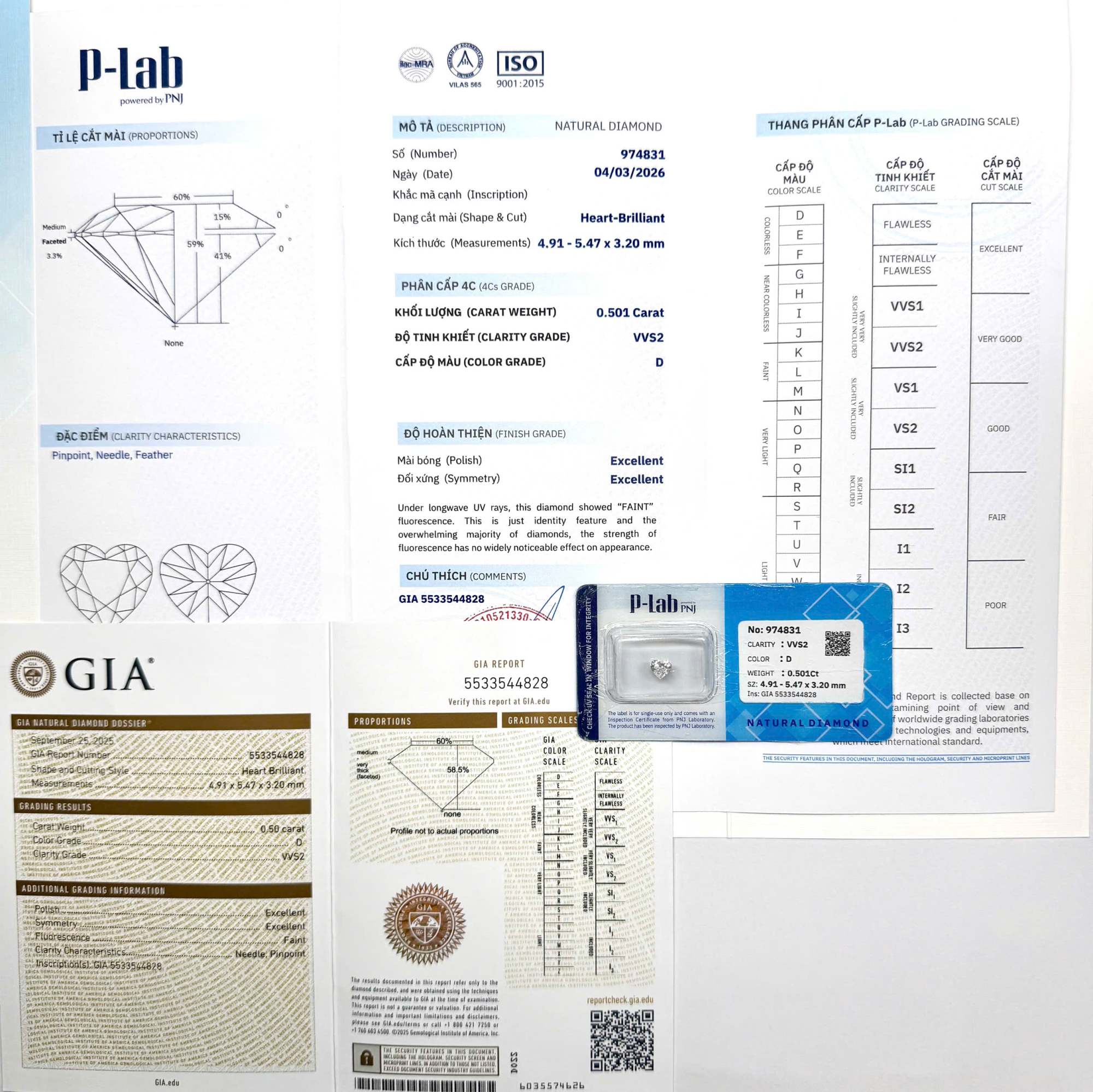 Viên kim cương HEART 5.4–4.9LY D/VVS2 gây ấn tượng với sắc trắng D tinh khiết và độ tinh khiết rất cao, tạo nên ánh sáng trong trẻo và rực rỡ. Dáng trái tim đầy đặn, mềm mại tượng trưng cho tình yêu chân thành và sự gắn bó lâu dài. Viên đá phù hợp chế tác mặt dây chuyền lãng mạn, nhẫn kỷ niệm hoặc bông tai thanh lịch với thiết kế tối giản để tôn dáng viên chủ.