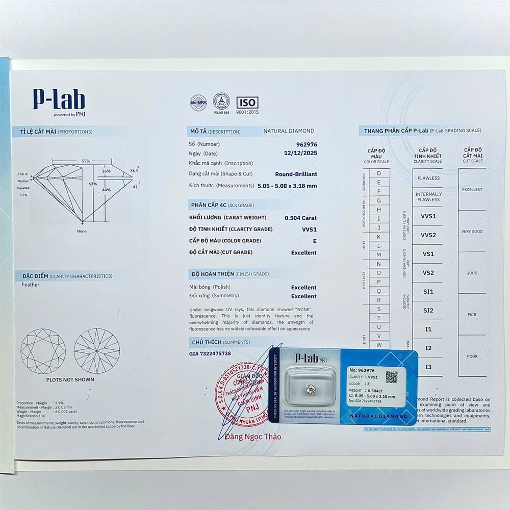 Viên kim cương 5.0LY E/VVS1 mang ánh sáng trong trẻo và sắc nét, tạo cảm giác tinh gọn nhưng đầy khí chất. Sắc trắng E giúp viên đá giữ được vẻ hiện đại, còn độ tinh khiết VVS1 khiến ánh lửa phản chiếu rõ ràng và liền mạch. Khi kết hợp với thiết kế tối giản, viên chủ trở thành điểm nhấn thanh lịch, sang trọng và rất cuốn hút.