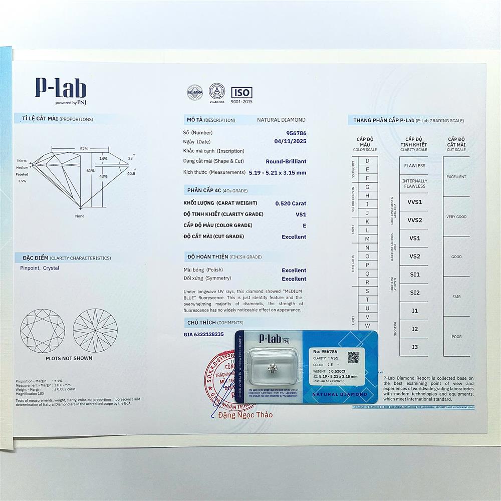 Viên kim cương 5.1–5.2LY E/VS1 sở hữu sắc trắng sáng tinh khiết và độ trong rõ nét, mang ý nghĩa sang trọng và thanh lịch. Kích thước vừa phải, phù hợp chế tác nhẫn, mặt dây chuyền hoặc bông tai tối giản. Họa tiết nhẹ nhàng sẽ tôn lên ánh sáng tự nhiên, làm nổi bật vẻ đẹp rực rỡ và tinh tế của viên chủ.