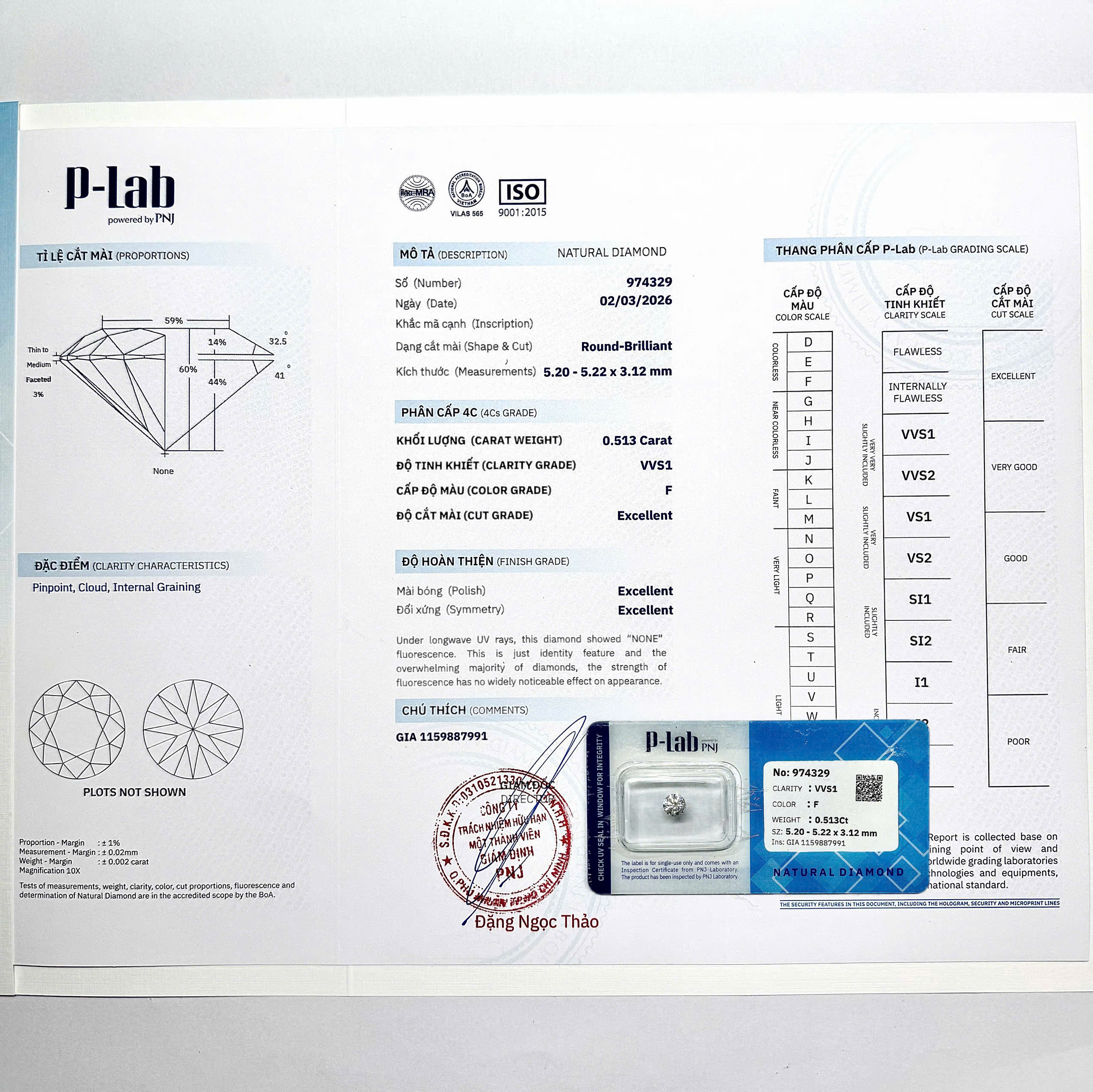 Viên kim cương 5.2LY F/VVS1 sở hữu sắc trắng tinh khiết cùng độ trong gần như hoàn hảo, tạo nên ánh sáng rực rỡ và sang trọng. Kích thước nổi bật giúp viên chủ dễ dàng tỏa sáng trong các thiết kế nhẫn solitaire, mặt dây chuyền hoặc bông tai thanh lịch. Kiểu dáng tối giản sẽ tôn trọn vẻ đẹp tinh khiết và độ lấp lánh tự nhiên của viên kim cương.