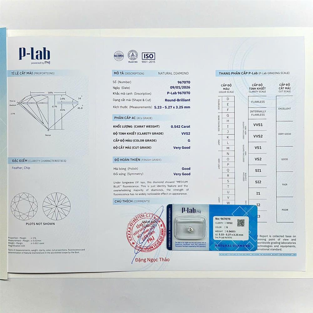 Viên kim cương 5.2LY sắc G mang sắc trắng tự nhiên cân bằng, tạo cảm giác hài hòa và sang trọng. Độ tinh khiết VVS2 cho cấu trúc gần như hoàn mỹ, ánh lửa rõ nét và ổn định. Phù hợp chế tác nhẫn chủ hoặc mặt dây tinh giản, dễ ứng dụng nhưng vẫn tôn lên vẻ đẹp tinh tế và đẳng cấp.