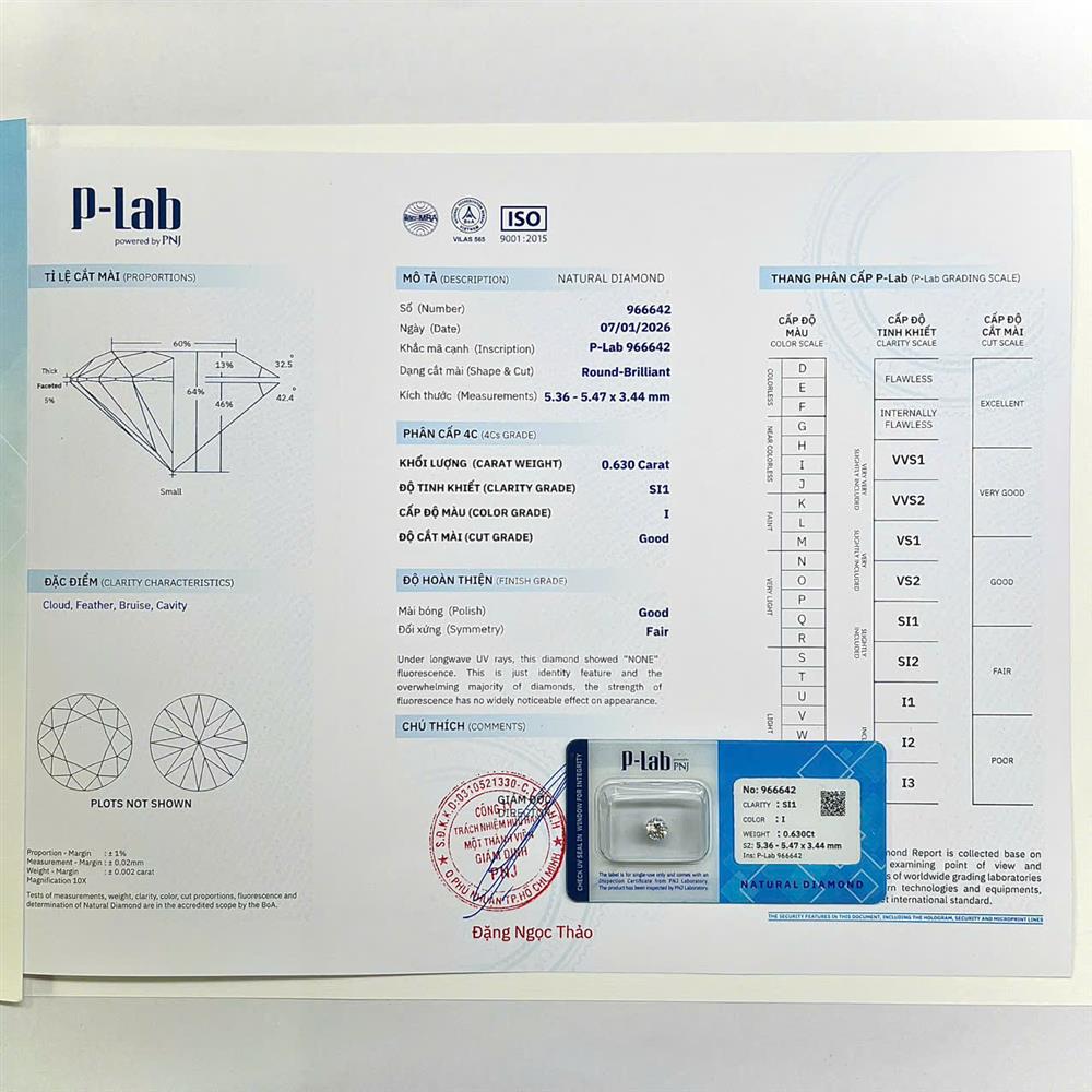 Viên kim cương 5.3-5.4LY sắc I mang ánh trắng ngà nhẹ, tạo cảm giác ấm áp và gần gũi. Độ tinh khiết SI1 vẫn đảm bảo độ trong hài hòa, ánh phản chiếu tự nhiên và dễ nhìn. Phù hợp chế tác nhẫn chủ hoặc mặt dây phong cách tinh giản, cân bằng giữa thẩm mỹ, giá trị và tính ứng dụng cao.