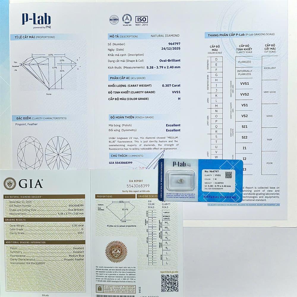Viên kim cương dáng oval 5.3–3.7LY sở hữu sắc H tươi sáng, mang lại cảm giác thanh lịch và dễ phối với nhiều phong cách trang sức hiện đại lẫn cổ điển. Độ tinh khiết VVS1 gần như hoàn hảo, các bao thể cực nhỏ, rất khó phát hiện ngay cả khi phóng đại. Phom oval mềm mại giúp viên kim cương trông thon gọn, tăng hiệu ứng ánh sáng và tạo vẻ sang trọng khi gắn nhẫn hoặc mặt dây.