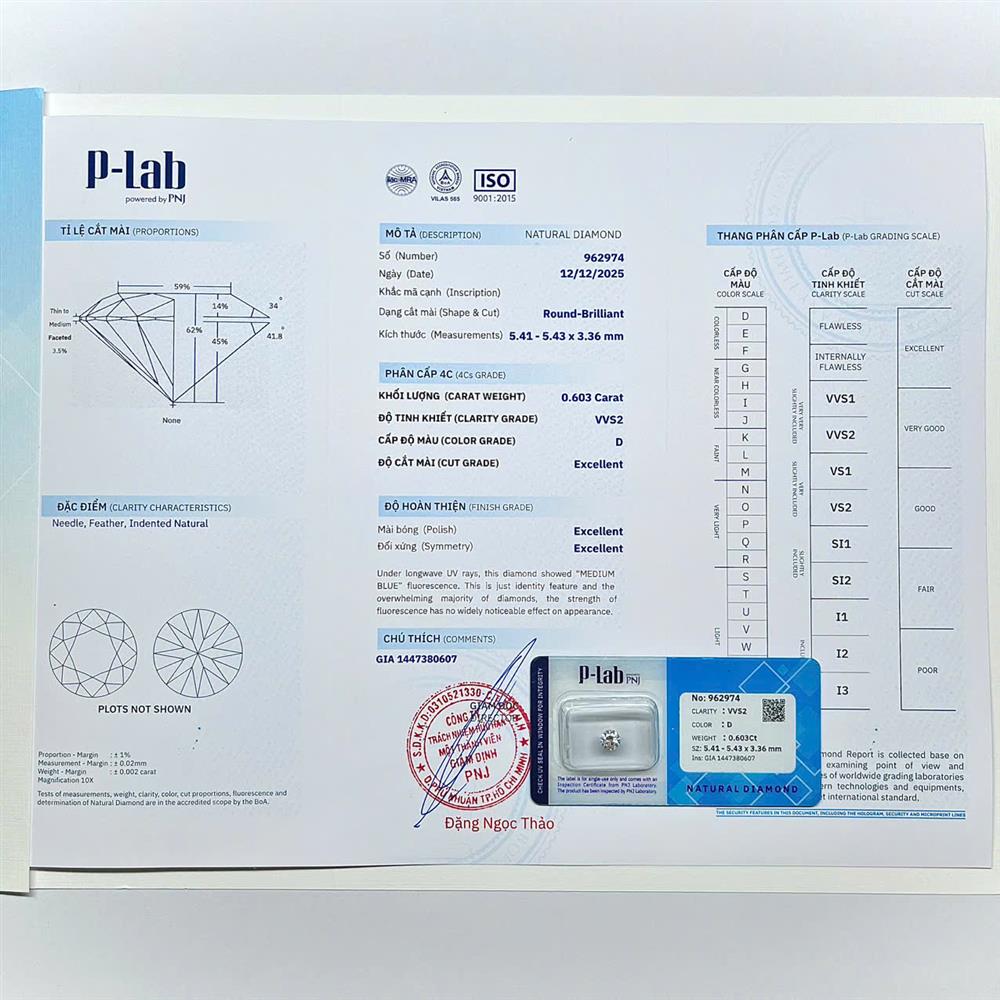 Viên kim cương 5.4LY D/VVS2 mang sắc trắng tinh khôi chuẩn mực, ánh sáng phản chiếu rõ và sắc nét như được tinh chỉnh kỹ lưỡng. Độ tinh khiết VVS2 tạo chiều sâu trong trẻo, giúp ánh lửa hiện lên mạch lạc và ổn định. Khi đặt vào thiết kế tối giản, viên chủ thể hiện phong thái sang trọng thuần khiết và rất dễ gây ấn tượng.