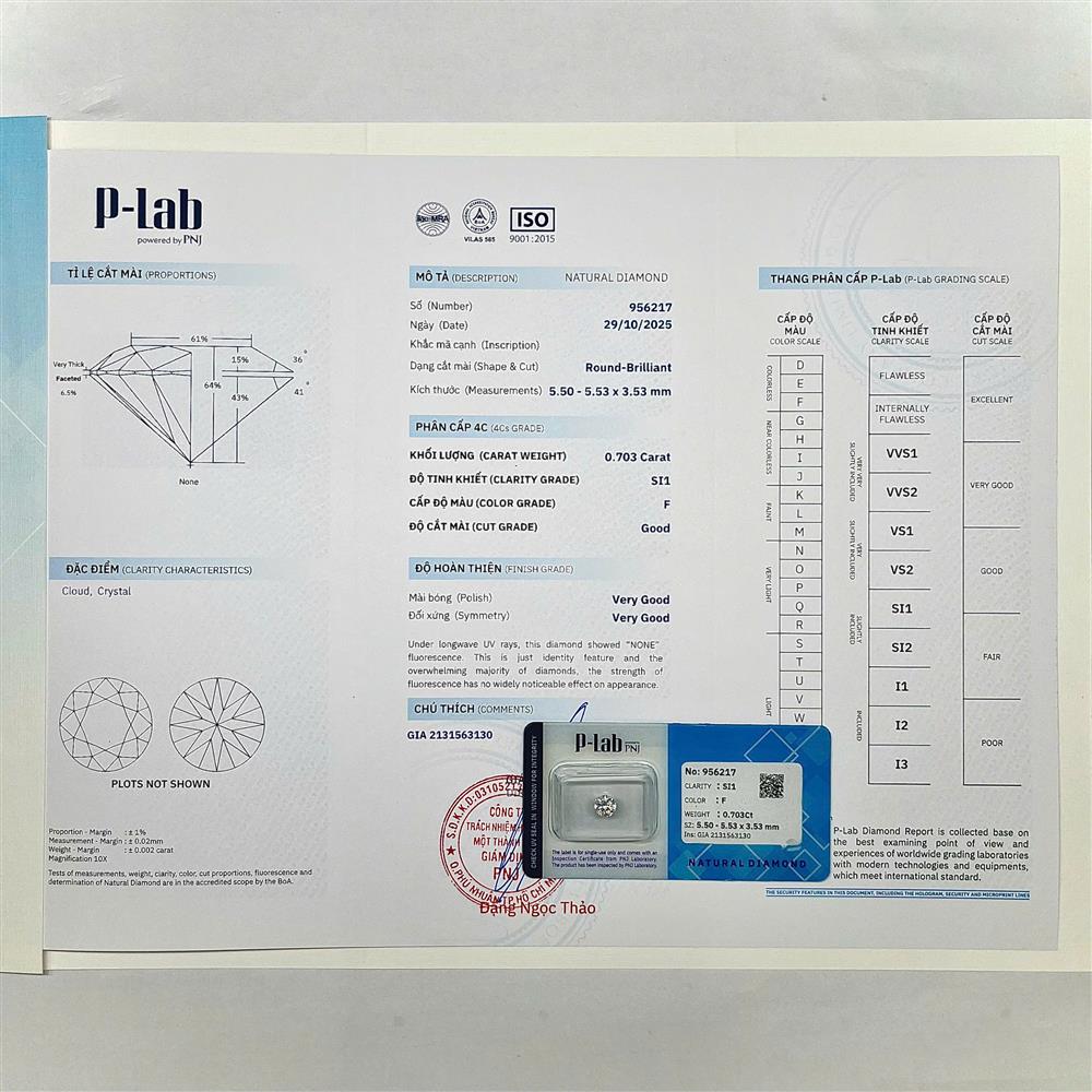 Viên kim cương 5.5LY F/SI1 mang sắc sáng tinh khiết, nhẹ nhàng mà sang trọng. Với độ trong cao và ánh lửa rực rỡ, viên này phù hợp chế tác nhẫn, mặt dây chuyền hoặc bông tai. Thiết kế nên tối giản, dùng vàng trắng hoặc bạch kim, để tôn trọn vẻ thanh lịch và rạng ngời của viên chủ.