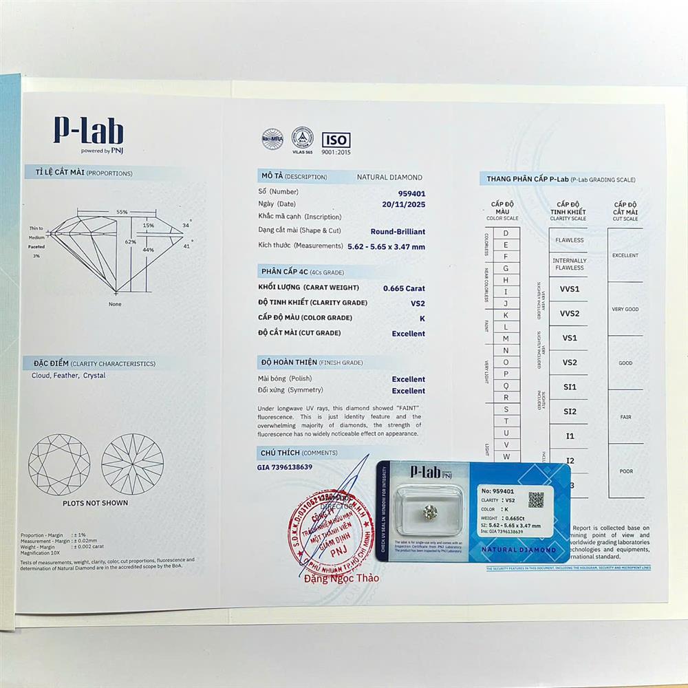Viên kim cương 5.6LY K/VS2 mang sắc ấm nhẹ, tạo cảm giác mềm mại và độc đáo. Độ trong VS2 giữ được độ sáng đẹp, phù hợp cho nhẫn đơn đá thanh mảnh, mặt dây minimalist hoặc bông tai nụ. Khi kết hợp họa tiết đơn giản, đường nét tinh gọn, viên chủ trở nên nổi bật hơn nhờ sắc độ ấm hài hòa và ánh lửa tự nhiên.
