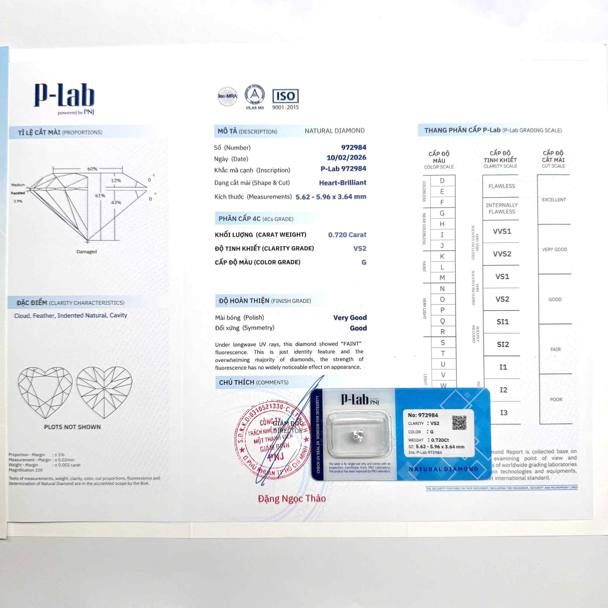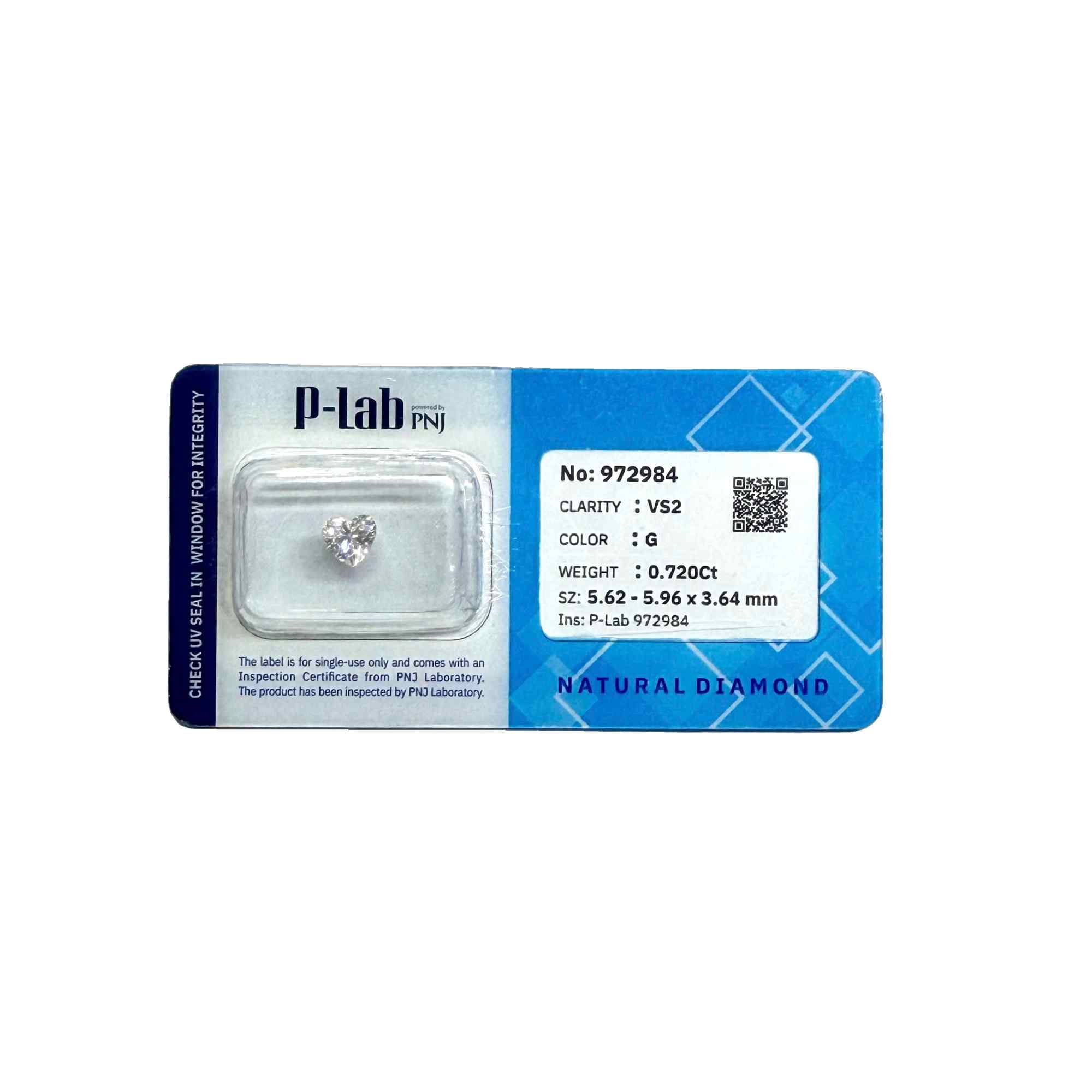 Viên kim cương HEART 5.6–5.9LY G/VS2 mang sắc trắng tự nhiên, ánh sáng trong và độ lấp lánh cân đối. Dáng trái tim đầy đặn với đường cong rõ nét giúp viên đá trở thành tâm điểm khi đính trên trang sức. Phù hợp chế tác nhẫn trung tâm hoặc mặt dây chuyền biểu tượng tình yêu, tạo điểm nhấn tinh tế và nổi bật.