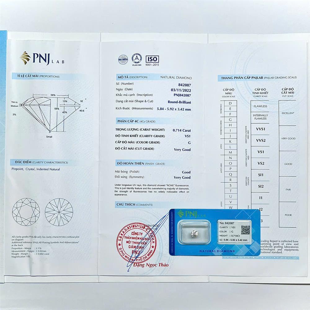 Viên kim cương 5.8 5.9LY G/VS1 mang sắc trắng ấm hài hòa, tạo cảm giác nhẹ nhàng nhưng không kém phần sang trọng. Ánh sáng phản chiếu tự nhiên, mềm mại và có chiều sâu nhờ độ trong VS1. Khi kết hợp với thiết kế tinh giản như nhẫn thanh mảnh hoặc mặt dây sạch nét, viên chủ toát lên vẻ đẹp cân bằng, trang nhã và rất dễ thu hút ánh nhìn.