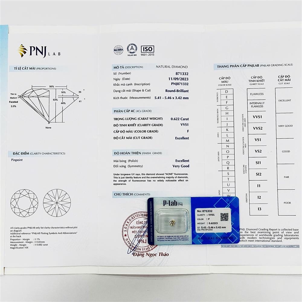 Viên kim cương 5.4 ly F/VVS1 toát lên vẻ tinh khiết, sang trọng, ý nghĩa về sự hoàn hảo và đẳng cấp. Phù hợp chế tác nhẫn solitaire, bông tai hay mặt dây chuyền với họa tiết tối giản, tinh tế. Thiết kế thanh thoát giúp tôn trọn vẻ sáng lấp lánh, nổi bật vẻ đẹp viên chủ.