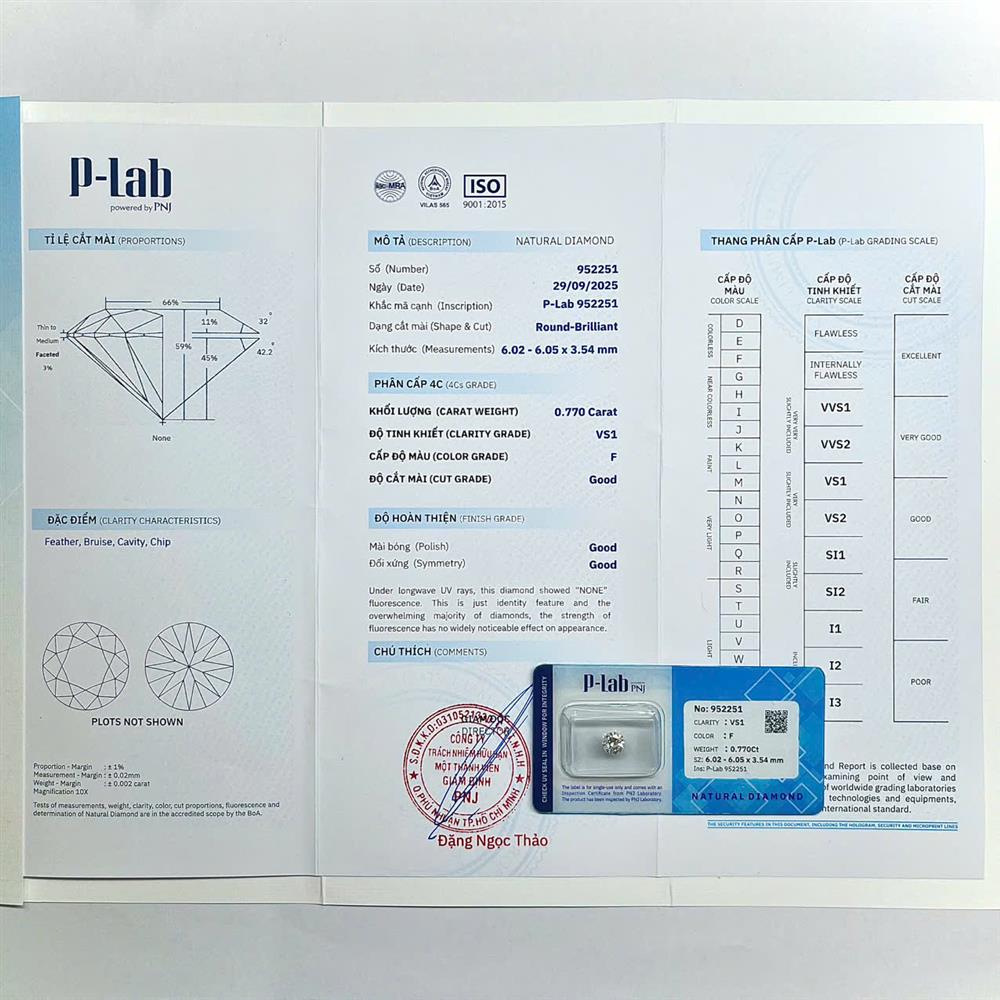 Viên kim cương 6.0LY sắc F mang vẻ trắng sáng tự nhiên, tạo ấn tượng thanh lịch và cao cấp. Độ tinh khiết VS1 giúp viên đá giữ được độ trong rõ nét, ánh lửa cân bằng và cuốn hút. Phù hợp chế tác nhẫn chủ hoặc mặt dây tinh giản, tôn vinh phong thái sang trọng, tinh tế và bền vững theo thời gian.