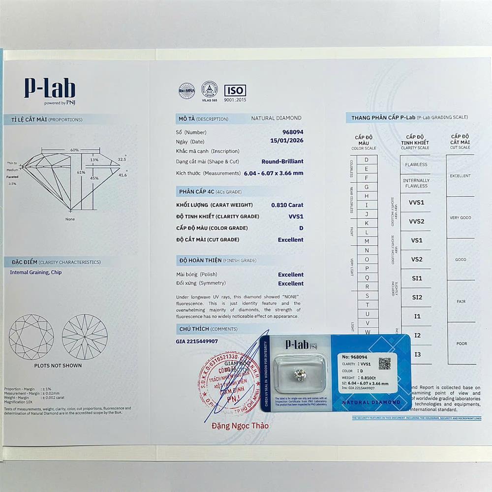 Viên kim cương 6.0LY sở hữu sắc D trắng tinh khiết tuyệt đối – cấp độ cao nhất trong thang màu, mang lại vẻ rực rỡ và thuần khiết hiếm có. Độ tinh khiết VVS1 gần như hoàn mỹ giúp ánh lửa sắc nét, trong trẻo ở mọi góc nhìn. Lựa chọn lý tưởng cho nhẫn chủ hoặc trang sức cao cấp, khẳng định gu thẩm mỹ sang trọng và giá trị bền vững.