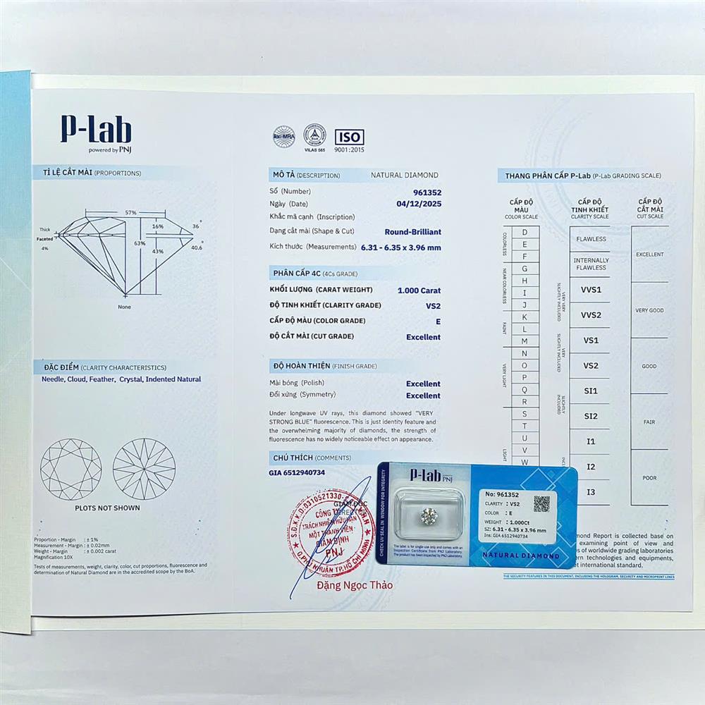 Viên kim cương 6.3LY E/VS2 sở hữu sắc trắng tinh tế, tạo vẻ sáng sang trọng nhưng không quá lạnh. Ánh sáng phản chiếu mượt mà, cho cảm giác ổn định và rất hài hòa ở mọi góc nhìn. Độ trong VS2 vẫn đảm bảo độ sắc nét cần thiết, khiến viên đá giữ được khí chất thanh lịch. Khi đặt vào thiết kế tinh gọn như nhẫn solitaire hoặc mặt dây hiện đại, vẻ đẹp cân bằng và trang nhã của viên chủ được thể hiện rõ rệt.