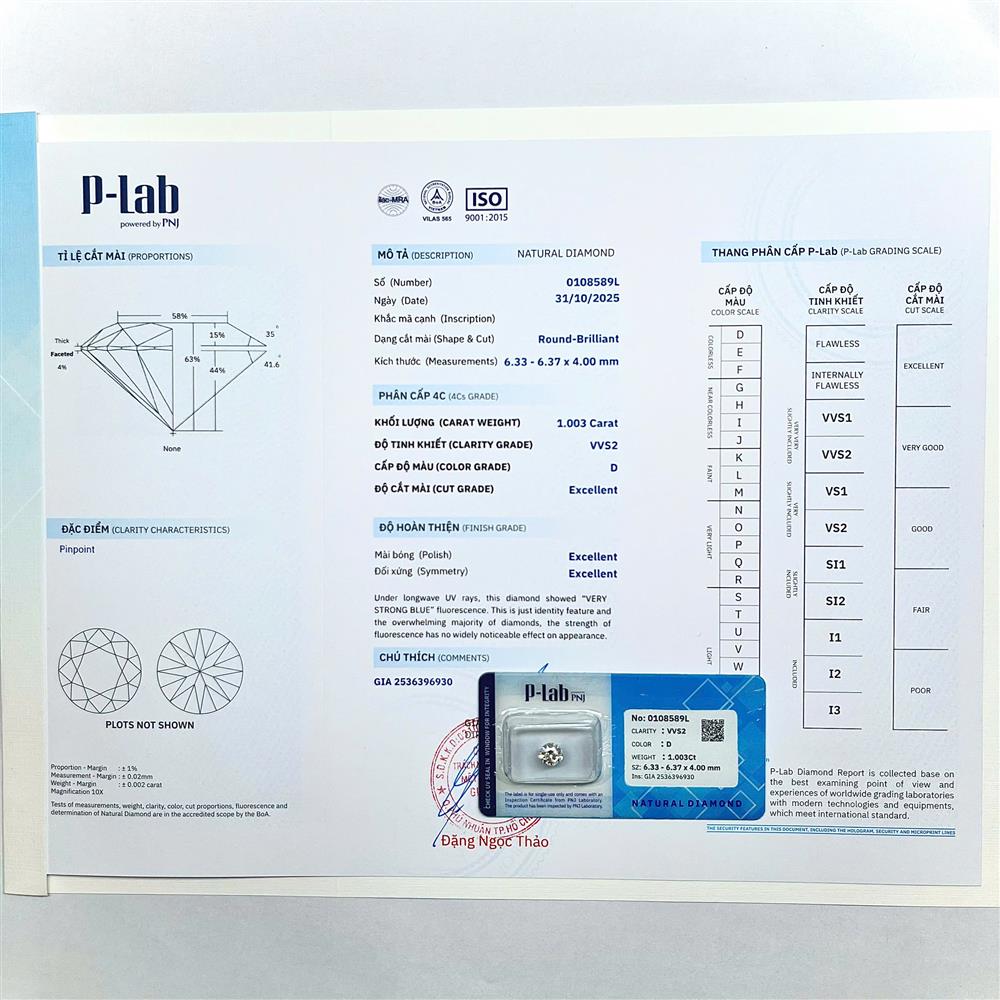 Viên kim cương 6.3LY D/VVS2 sở hữu sắc trắng tinh khiết tuyệt đối và độ trong gần như hoàn hảo, tượng trưng cho sự thuần khiết và đẳng cấp. Kích thước vừa vặn, lý tưởng để chế tác nhẫn, bông tai hoặc mặt dây chuyền sang trọng. Khi kết hợp họa tiết tối giản, ánh sáng mạnh mẽ và vẻ đẹp hoàn mỹ của viên chủ được tôn vinh trọn vẹn.