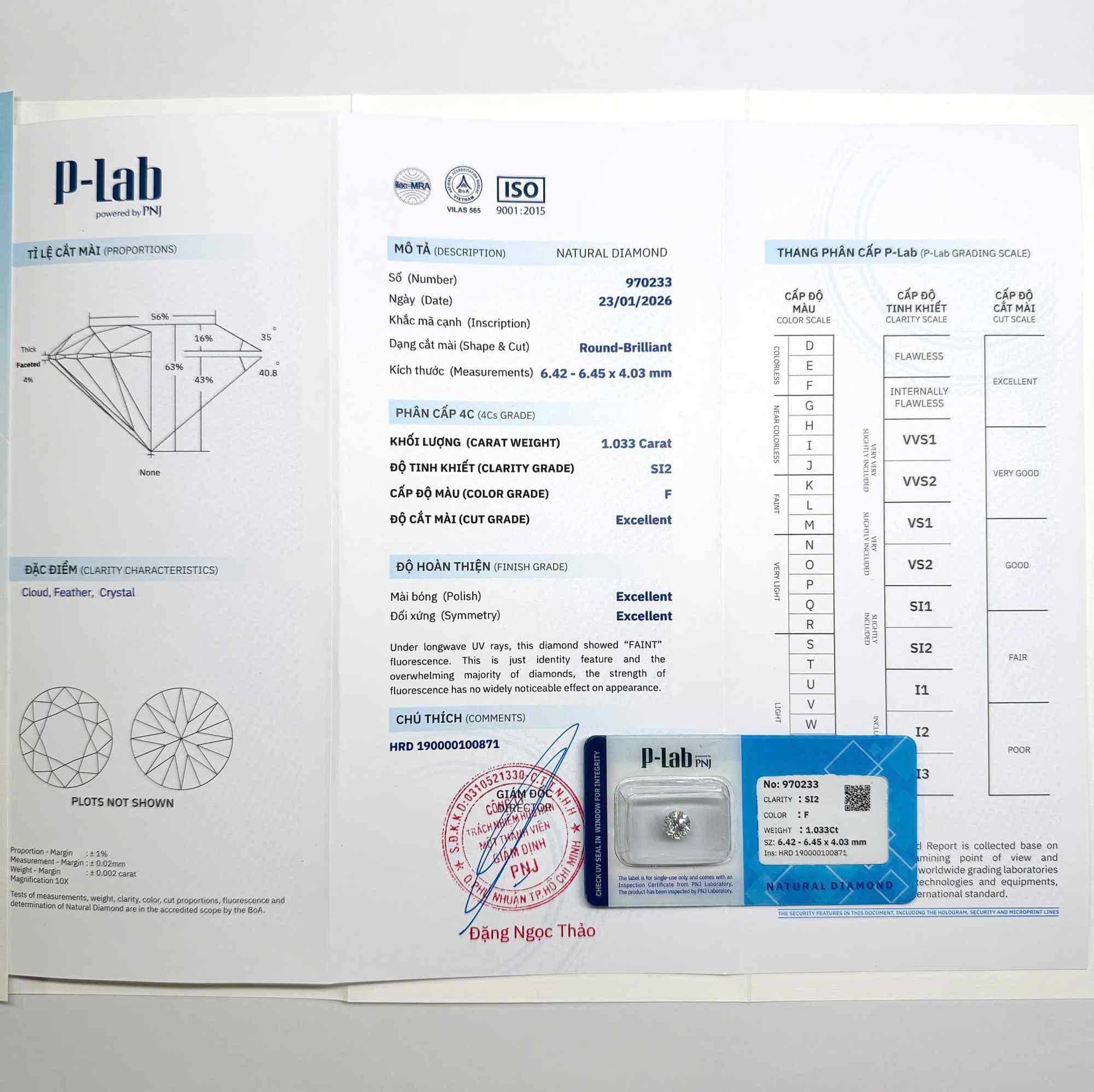 Viên kim cương 6.4LY sắc F gây ấn tượng mạnh với kích thước lớn, nổi bật ngay từ ánh nhìn đầu tiên. Gam màu trắng sáng tự nhiên giúp viên đá vẫn giữ được độ rực rỡ và sang trọng. Độ tinh khiết SI2 phù hợp để chế tác trang sức bản lớn, khi lên tay vẫn bắt sáng tốt, tạo hiệu ứng lấp lánh cuốn hút, thể hiện cá tính và phong thái tự tin.