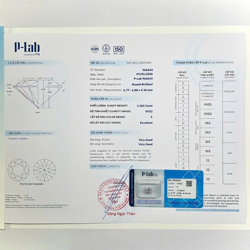 Viên kim cương 6.7–6.8LY toát lên vẻ sang trọng rõ nét nhờ sắc F trắng sáng và độ tinh khiết VVS2 cao cấp. Cấu trúc trong trẻo với bao thể rất nhỏ giúp ánh sáng phản xạ tốt, tạo độ lấp lánh mạnh và cảm giác giá trị cao, đặc biệt phù hợp cho các thiết kế trang sức làm điểm nhấn trung tâm.
